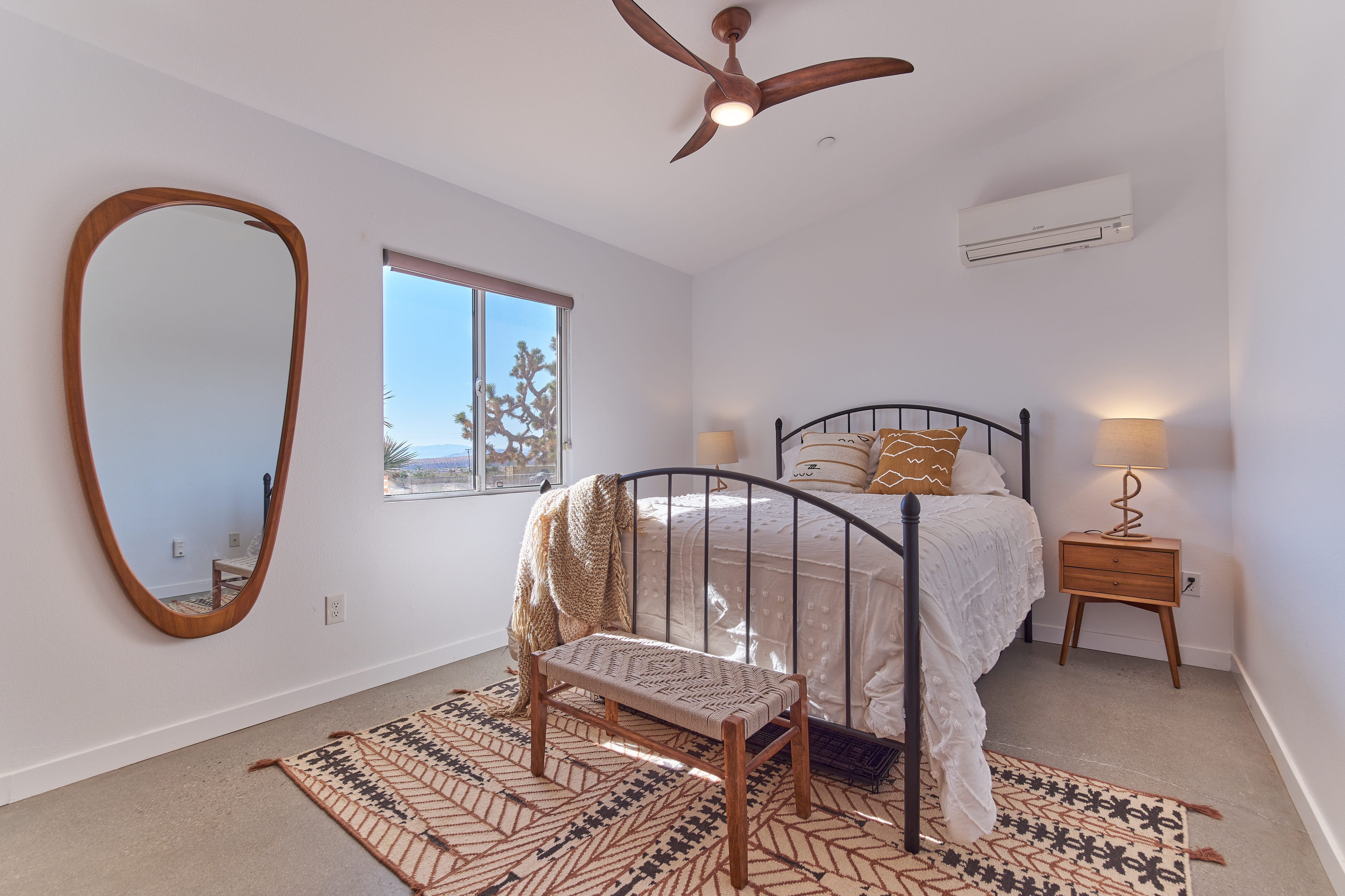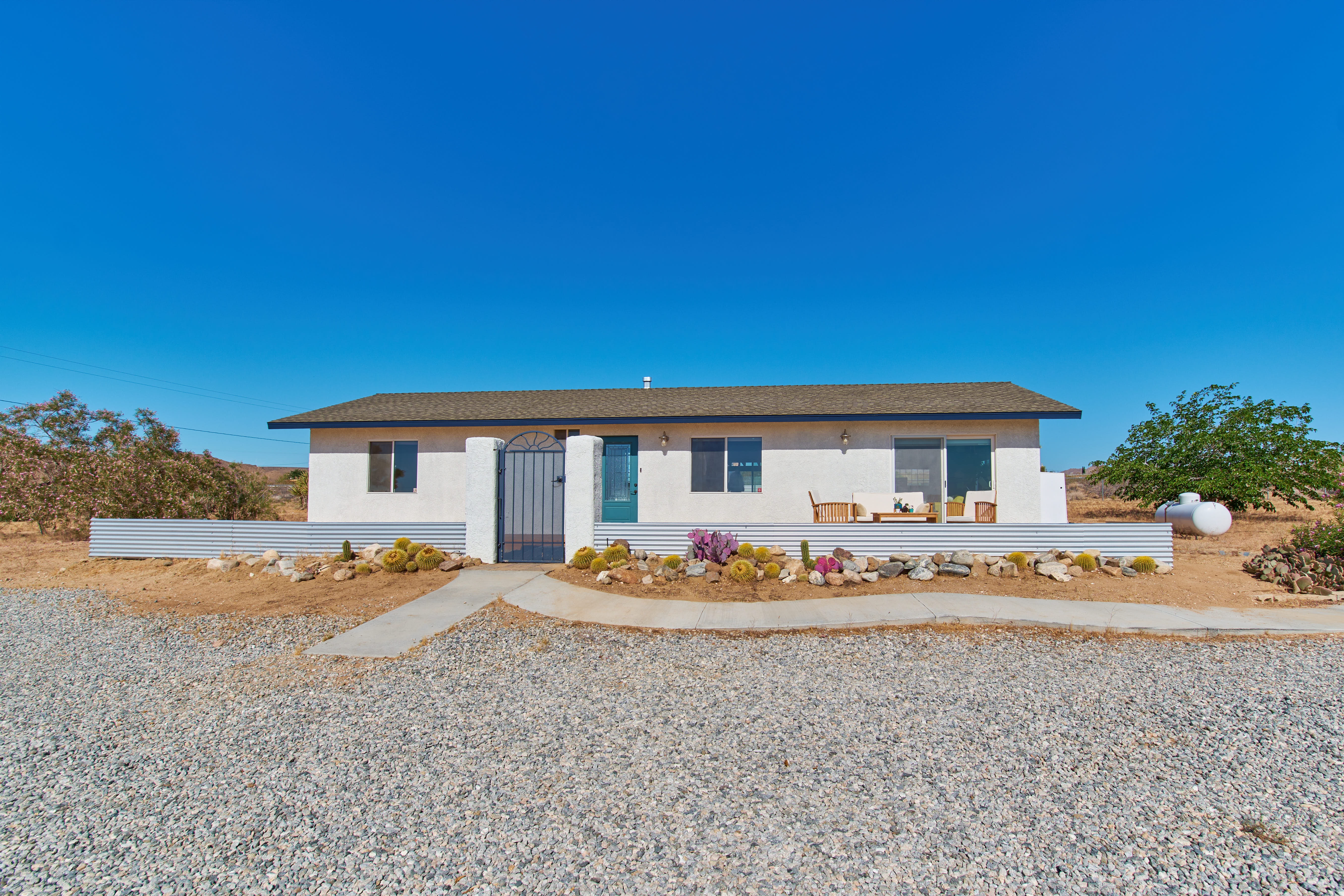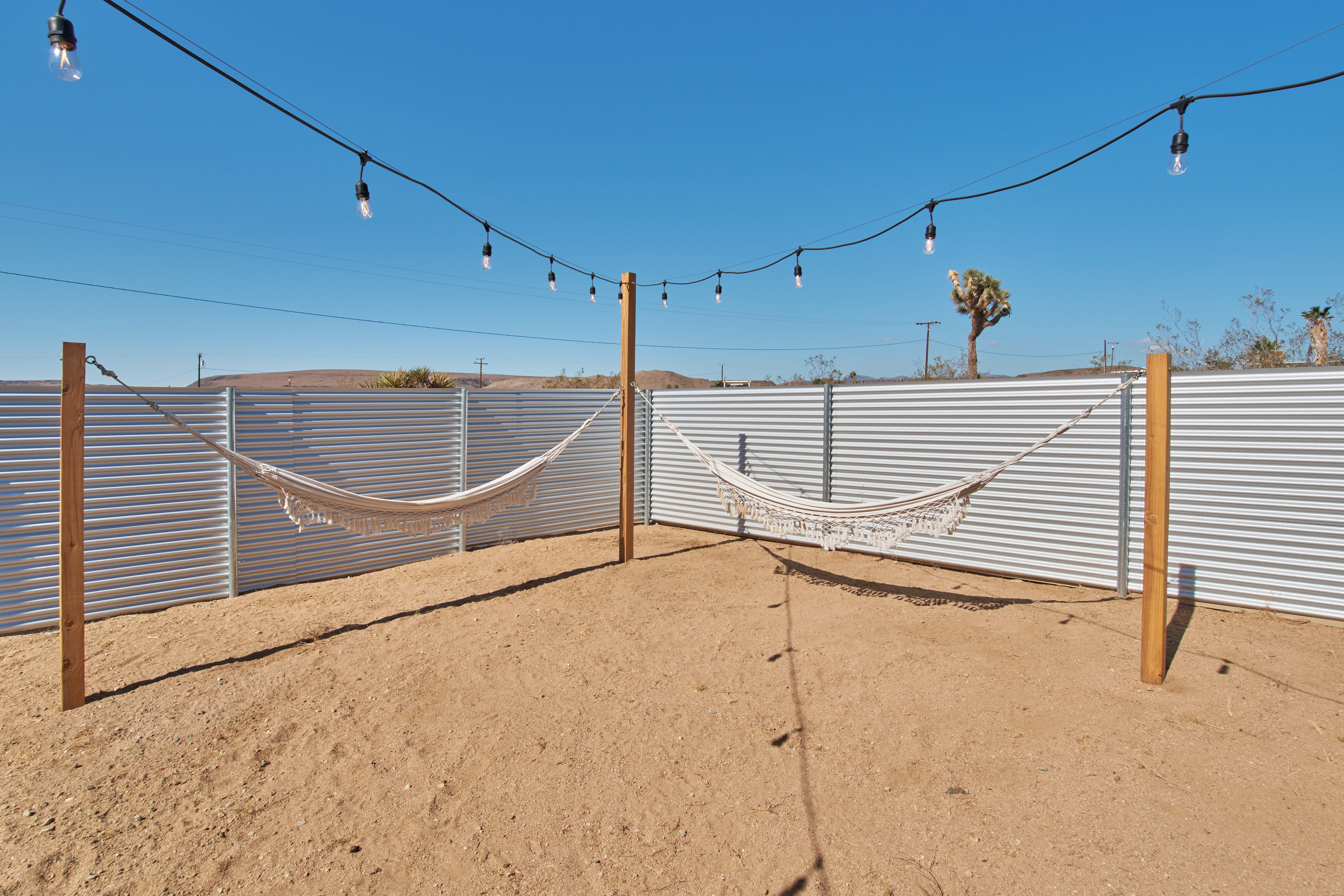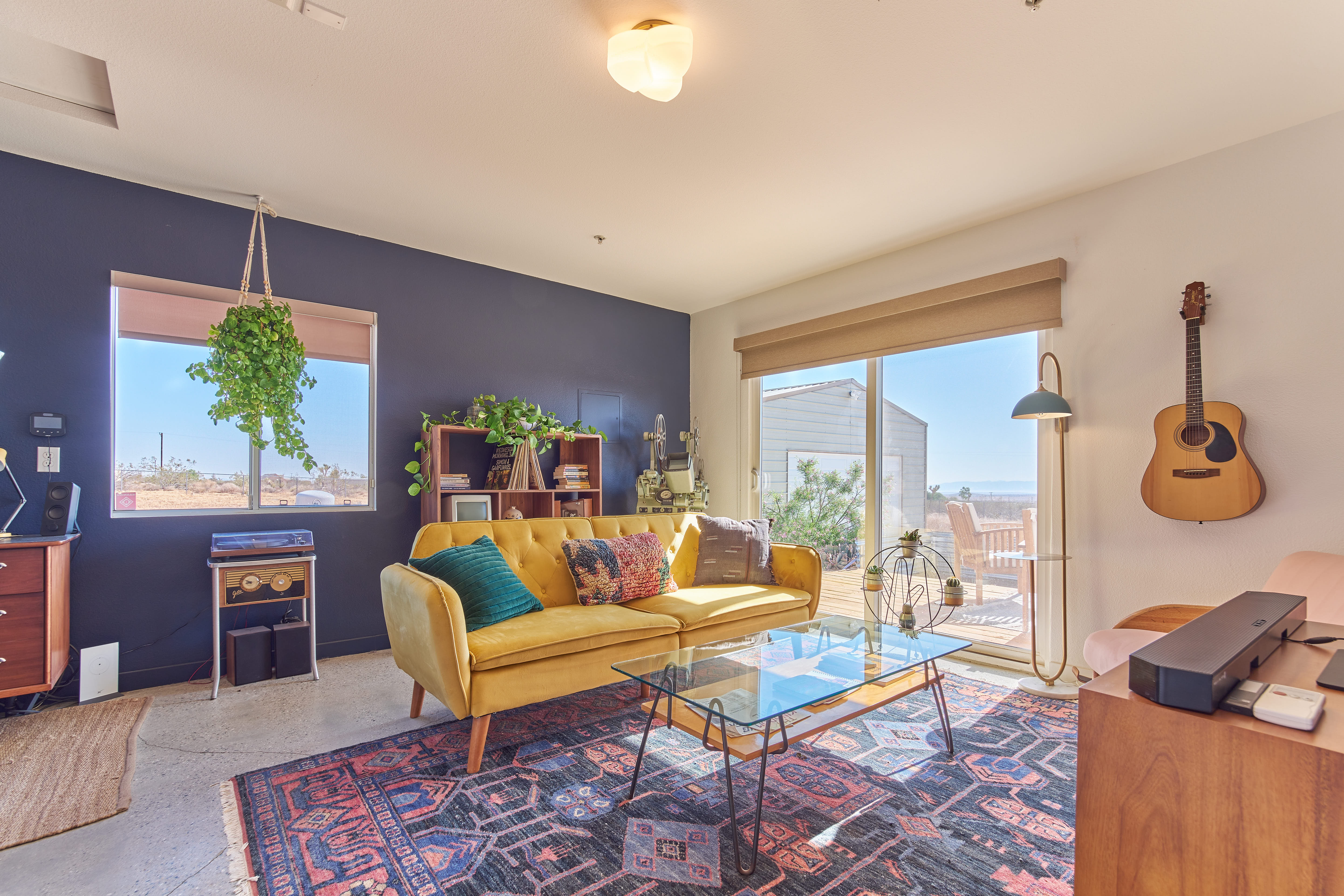 Mid-scale 2 bedroom, 1 bath desert home with a sizable kitchen and living area. Private 4 acres and tons of parking. Features a large Joshua Tree in the front yard. Killer blood red sunrises and sunsets from a porch view overlooking a valley. Furnishings range from desert boho to mid-century modern. Backyard is fenced with a hot tub, string lights and two hammocks. Two desk spaces, one with a large Dell editing monitor. A few retro display items: a classic Mac, a Moviola, 50s TV.