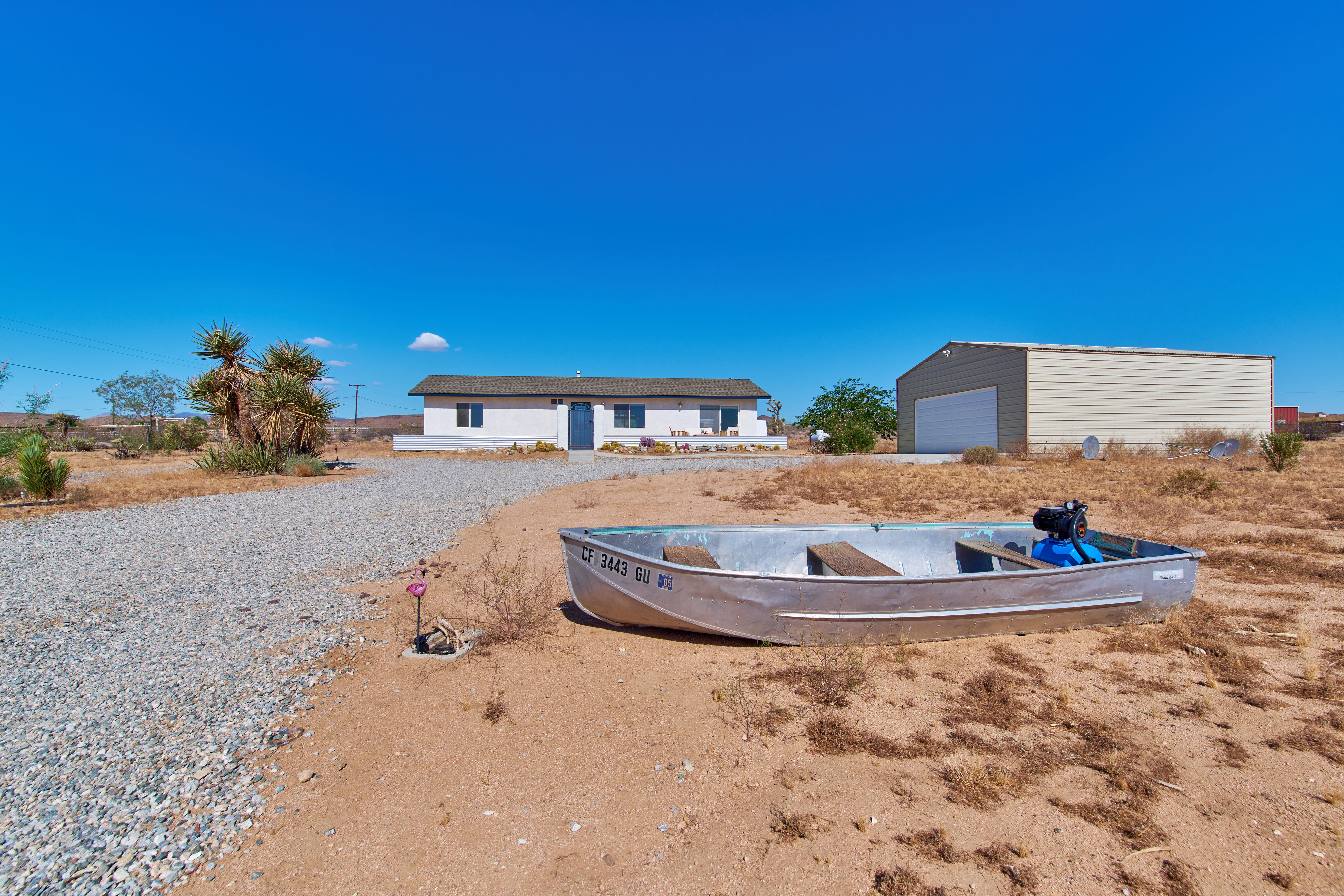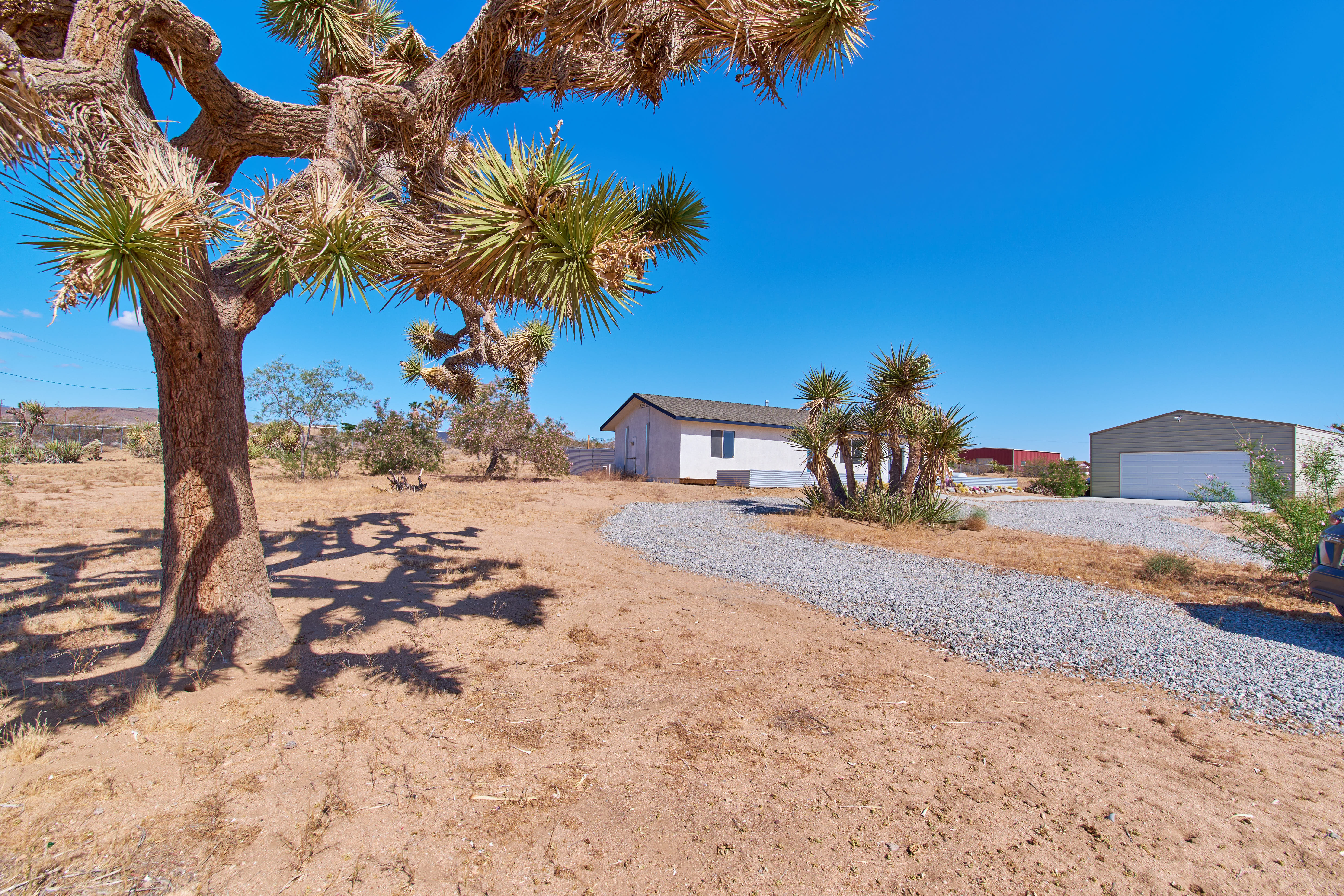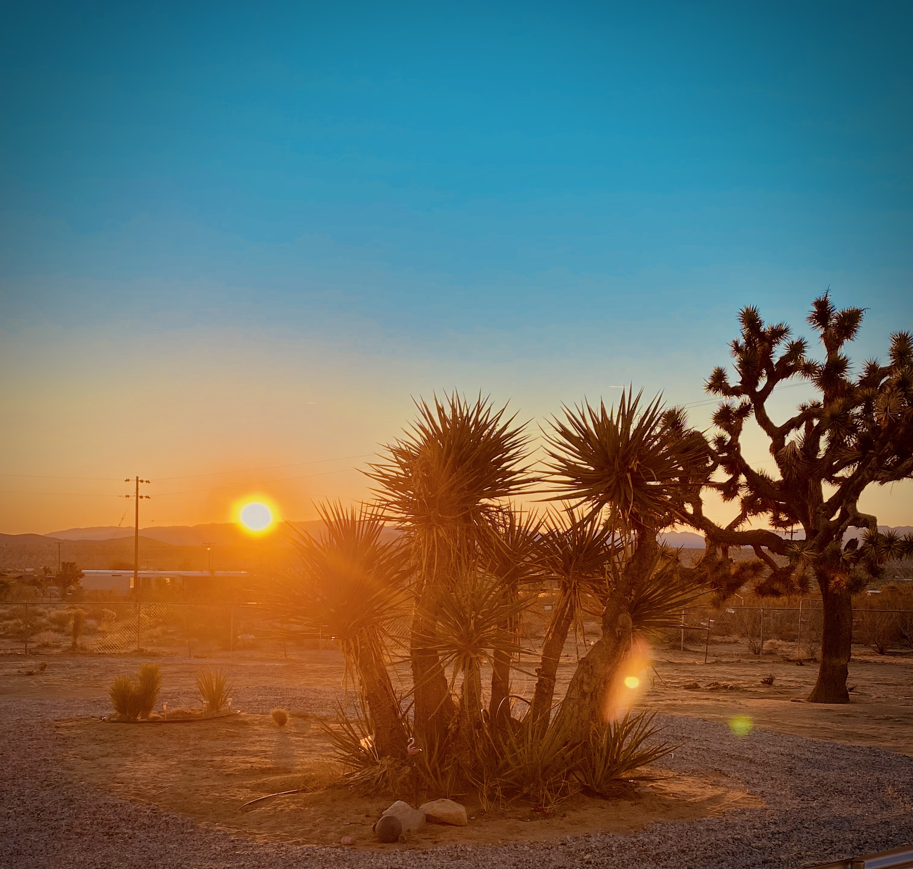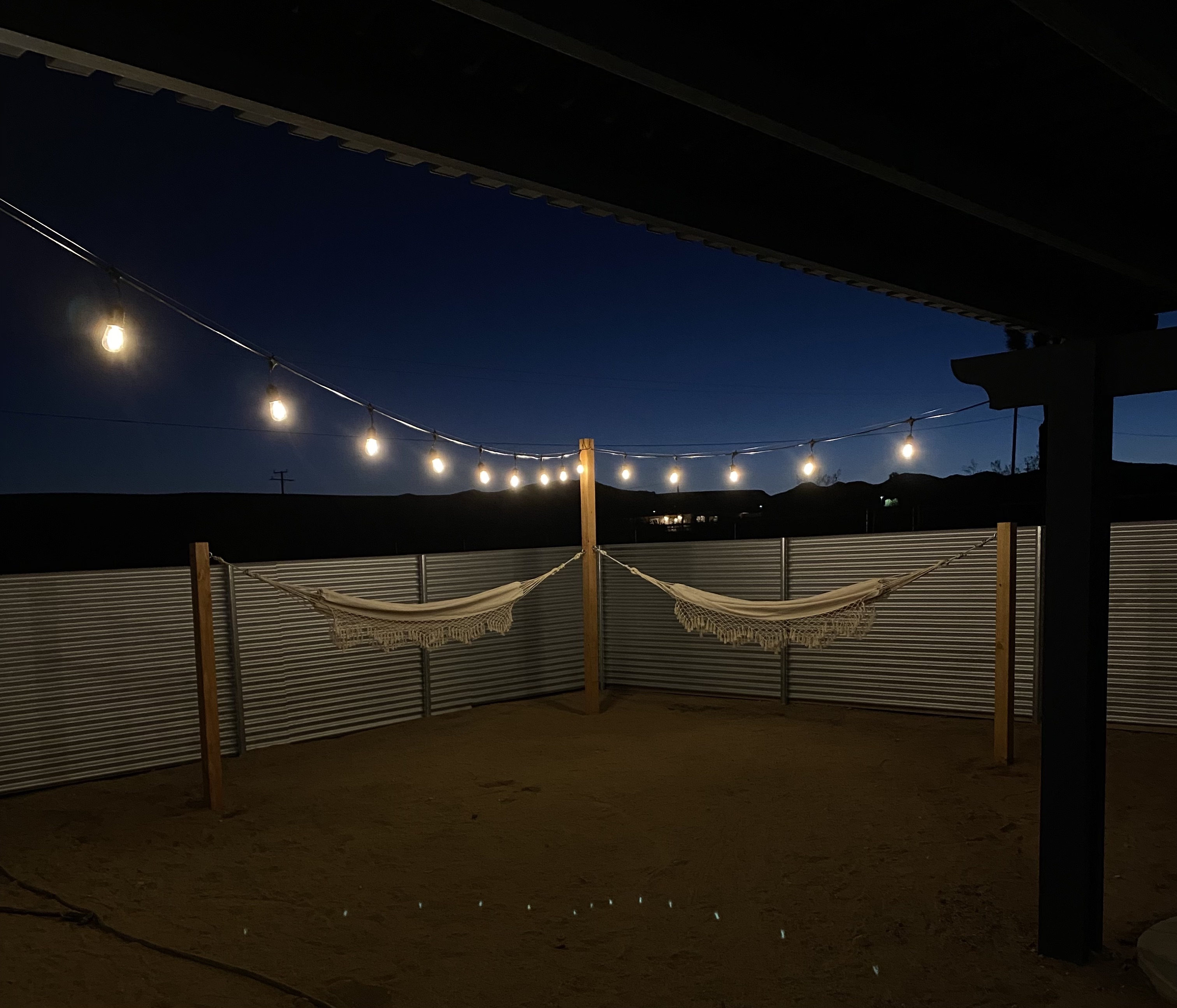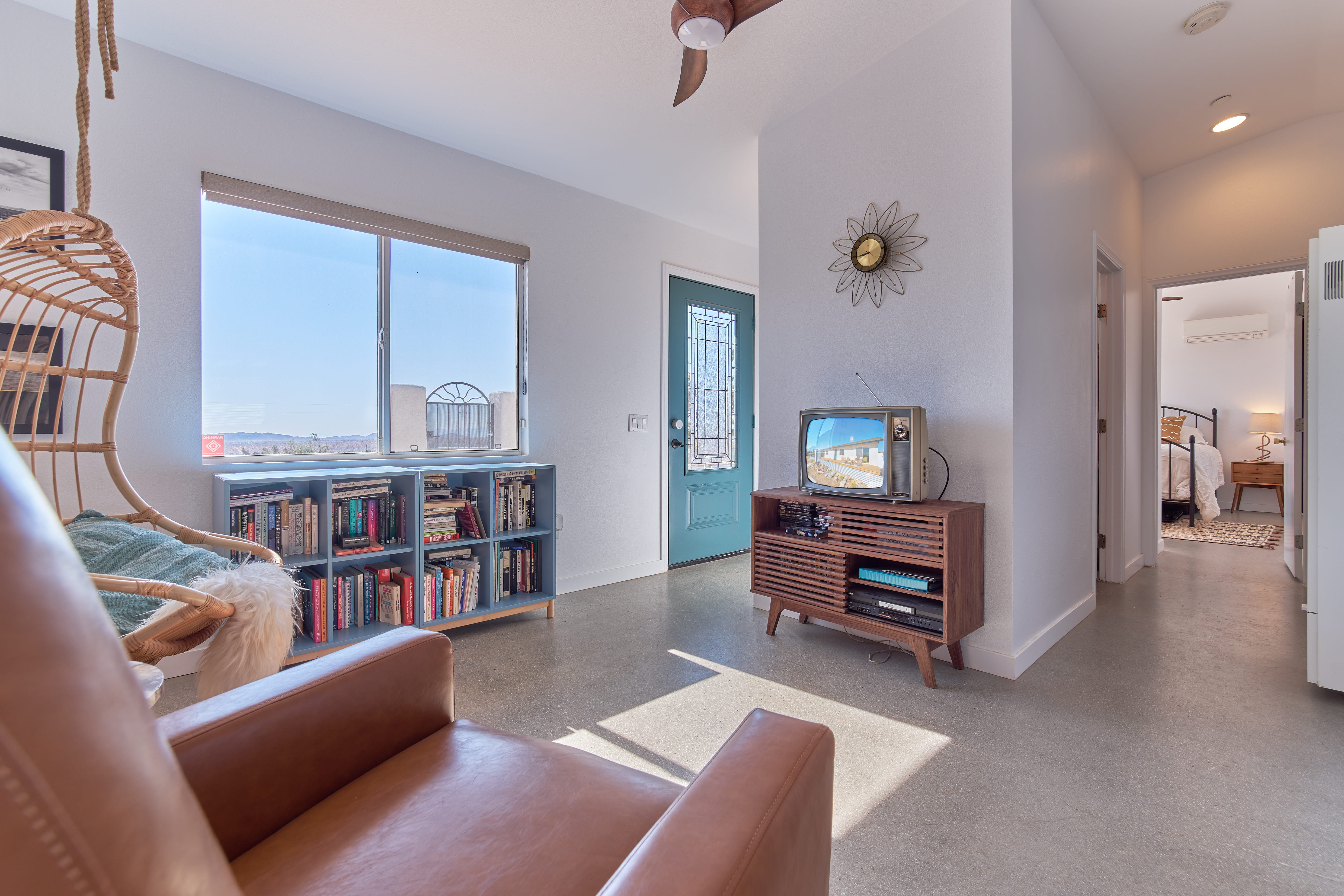 Mid-scale 2 bedroom, 1 bath desert home with a sizable kitchen and living area. Private 4 acres and tons of parking. Features a large Joshua Tree in the front yard. Killer blood red sunrises and sunsets from a porch view overlooking a valley. Furnishings range from desert boho to mid-century modern. Backyard is fenced with a hot tub, string lights and two hammocks. Two desk spaces, one with a large Dell editing monitor. A few retro display items: a classic Mac, a Moviola, 50s TV.
