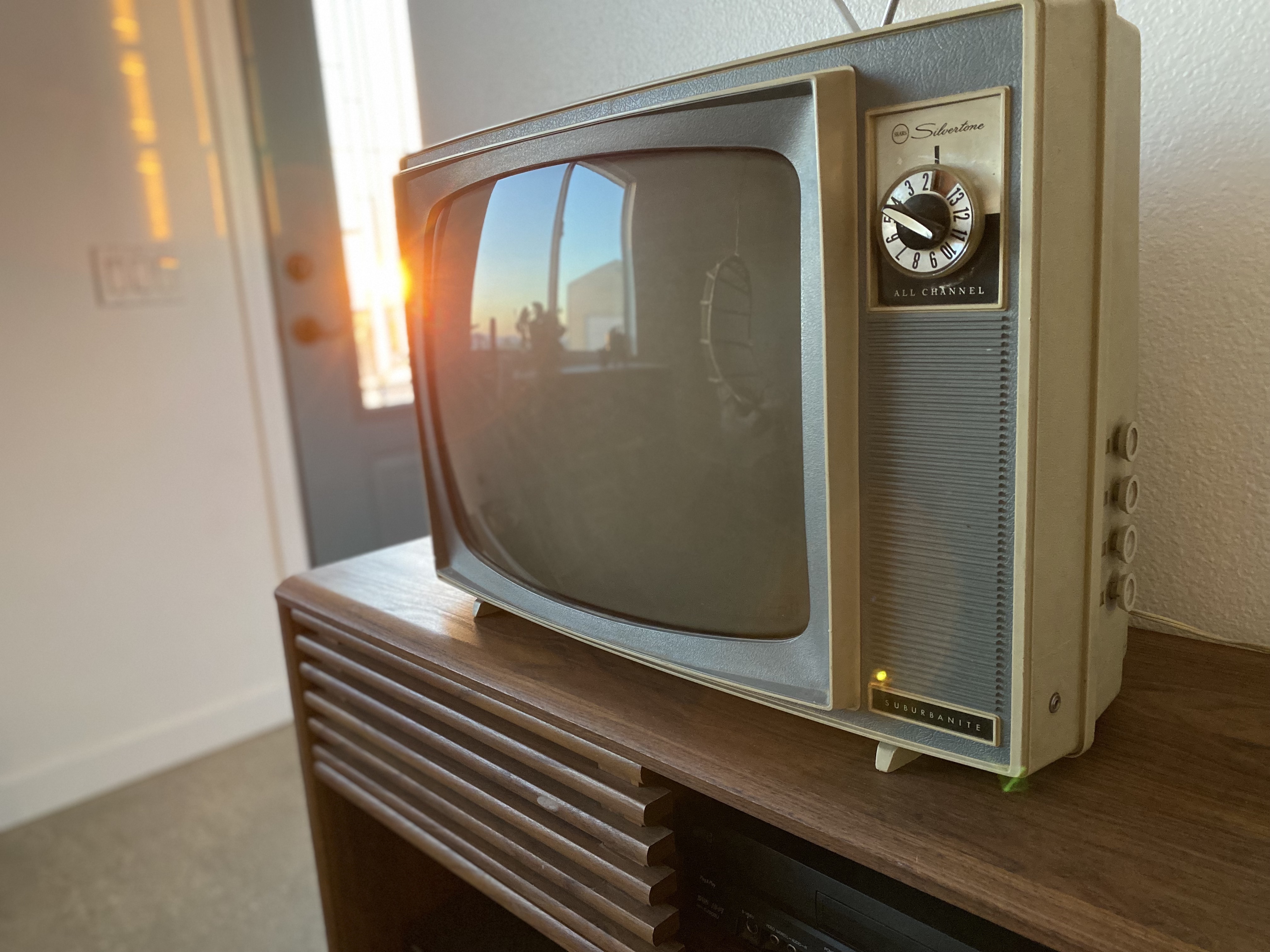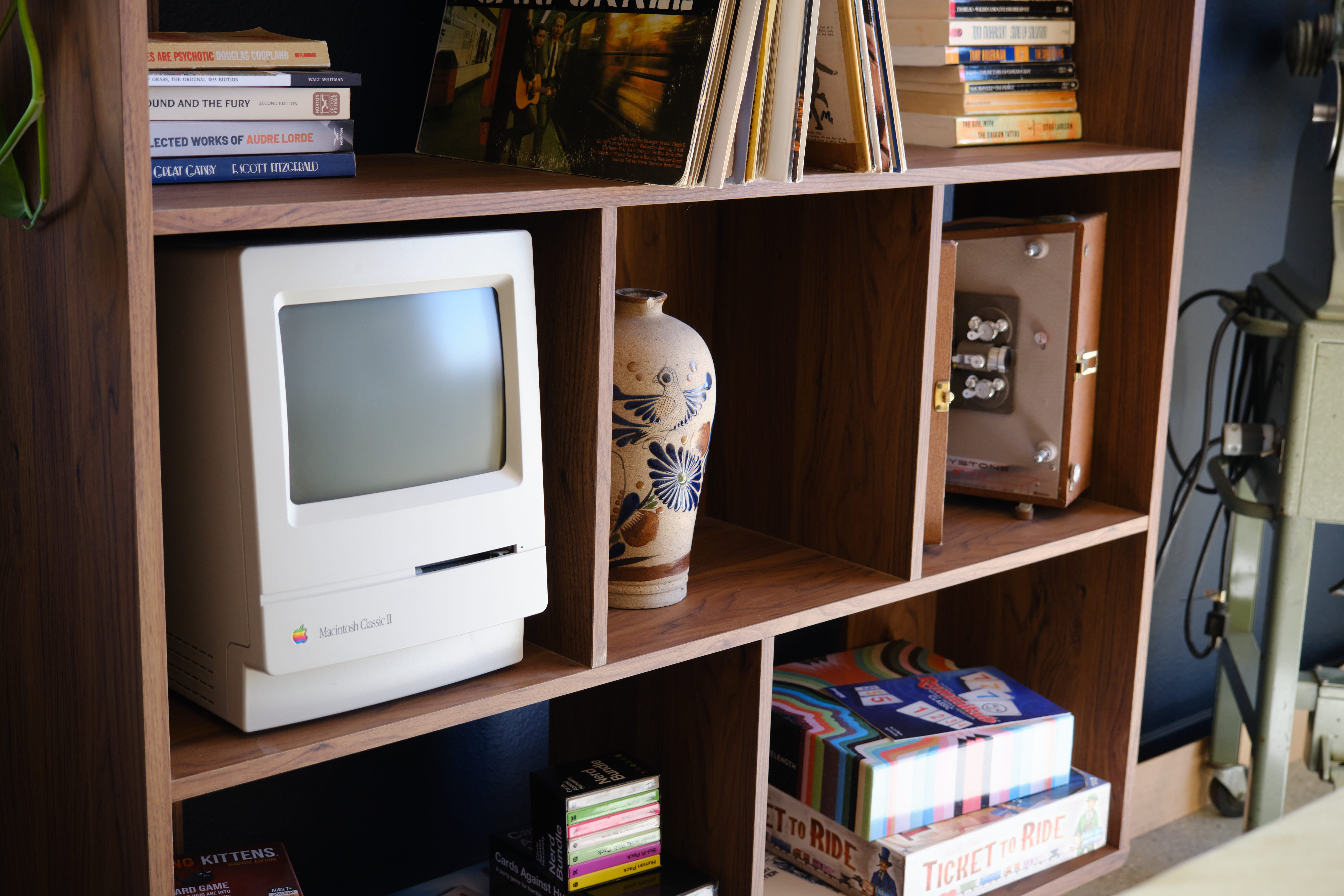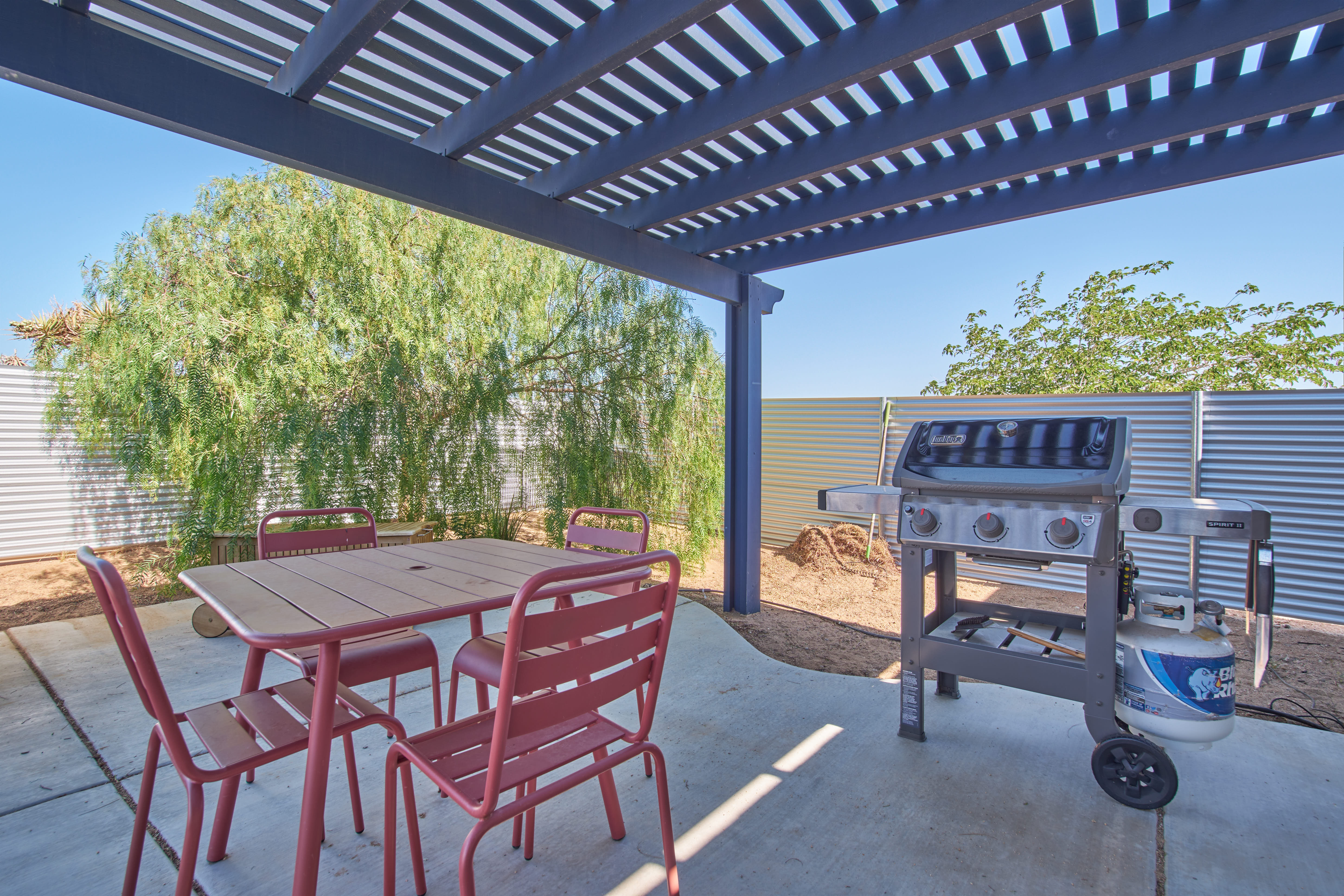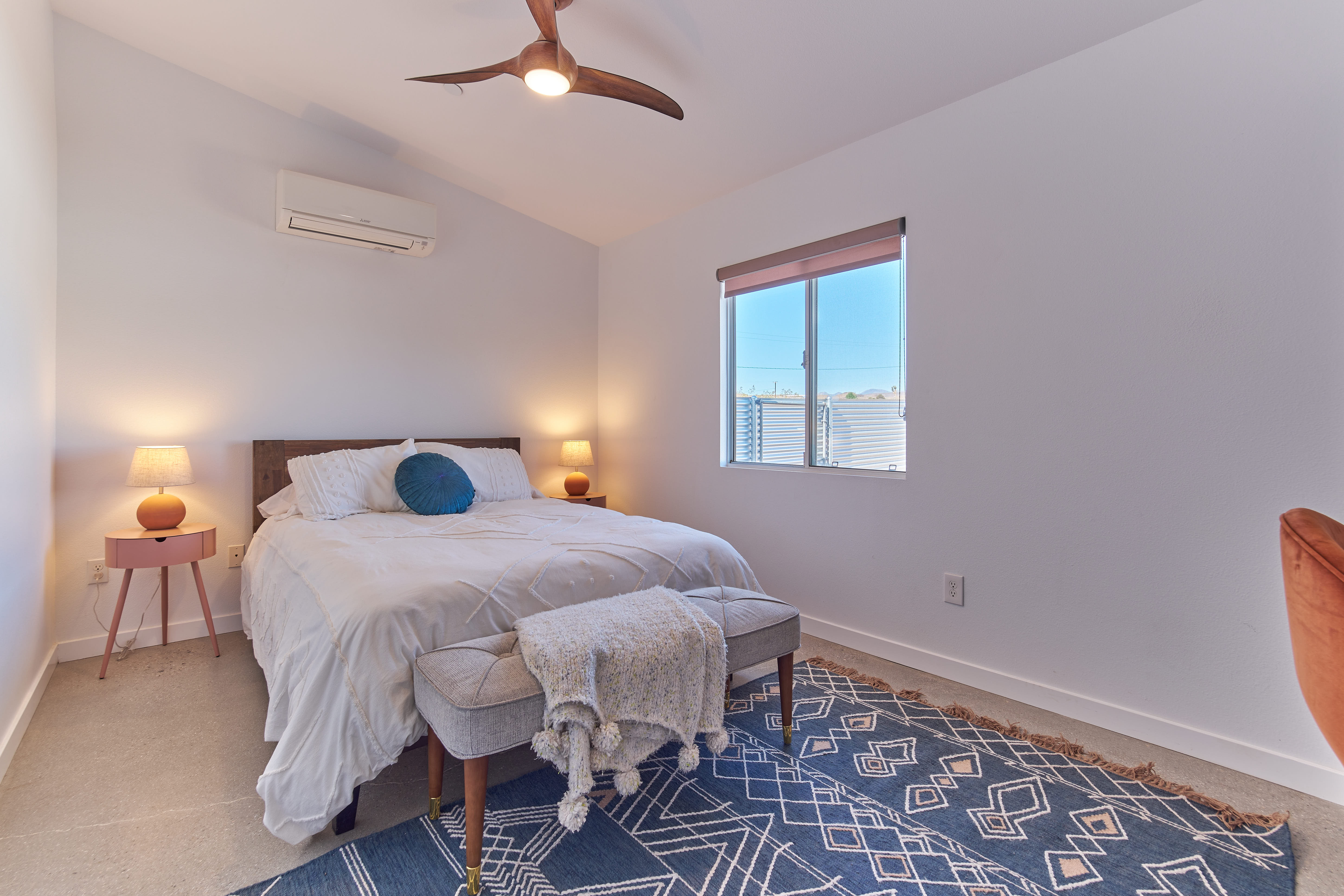 Mid-scale 2 bedroom, 1 bath desert home with a sizable kitchen and living area. Private 4 acres and tons of parking. Features a large Joshua Tree in the front yard. Killer blood red sunrises and sunsets from a porch view overlooking a valley. Furnishings range from desert boho to mid-century modern. Backyard is fenced with a hot tub, string lights and two hammocks. Two desk spaces, one with a large Dell editing monitor. A few retro display items: a classic Mac, a Moviola, 50s TV.