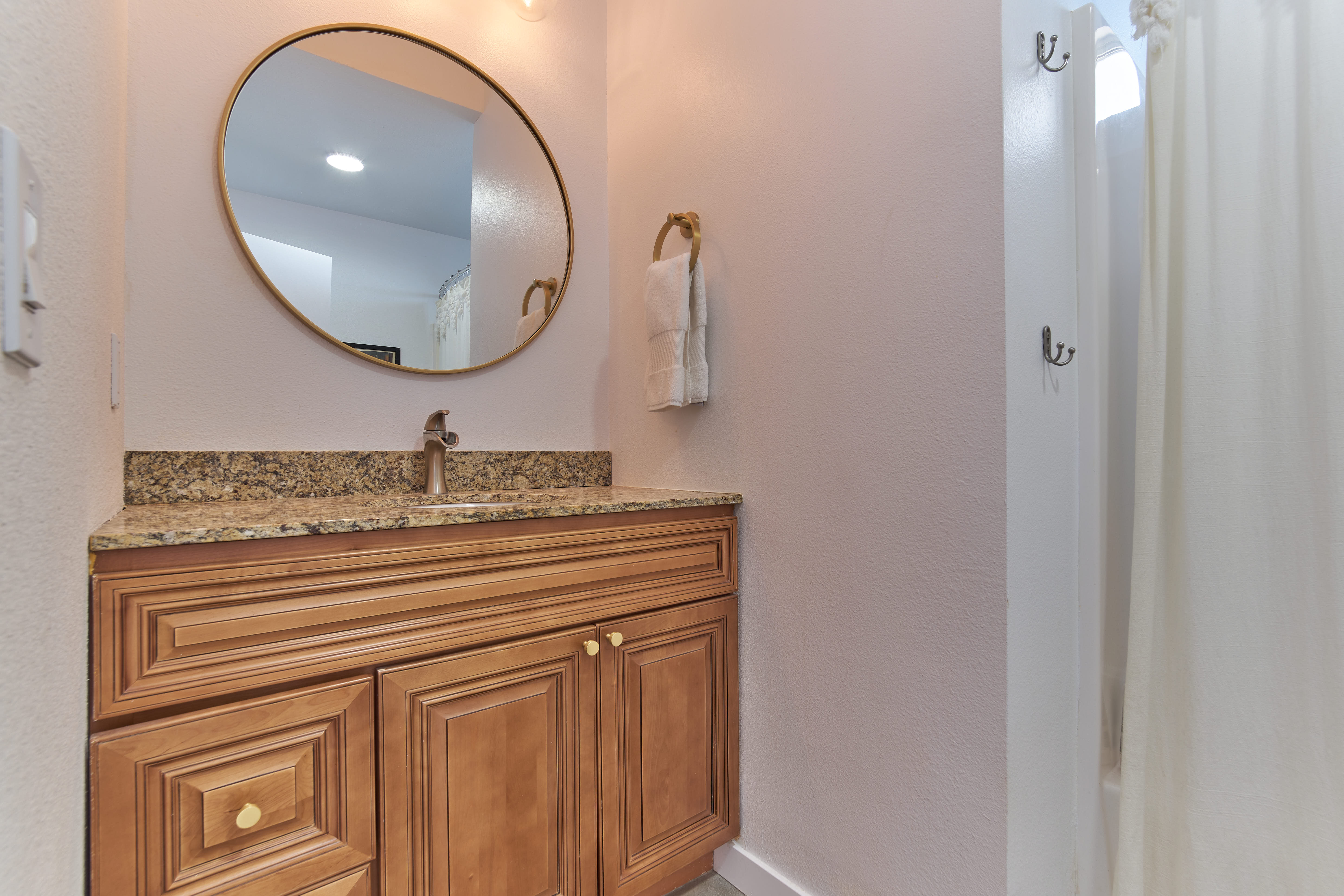 1 bathroom. Fiberglass tub/shower. 1 sink, 1 toilet. Circle mirror. :)