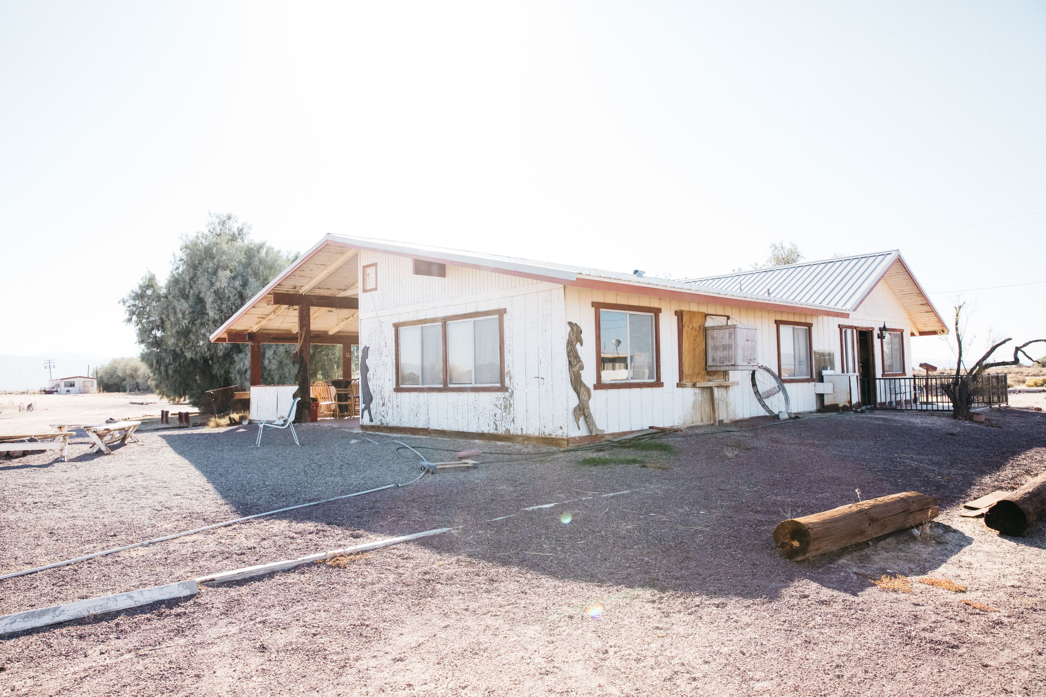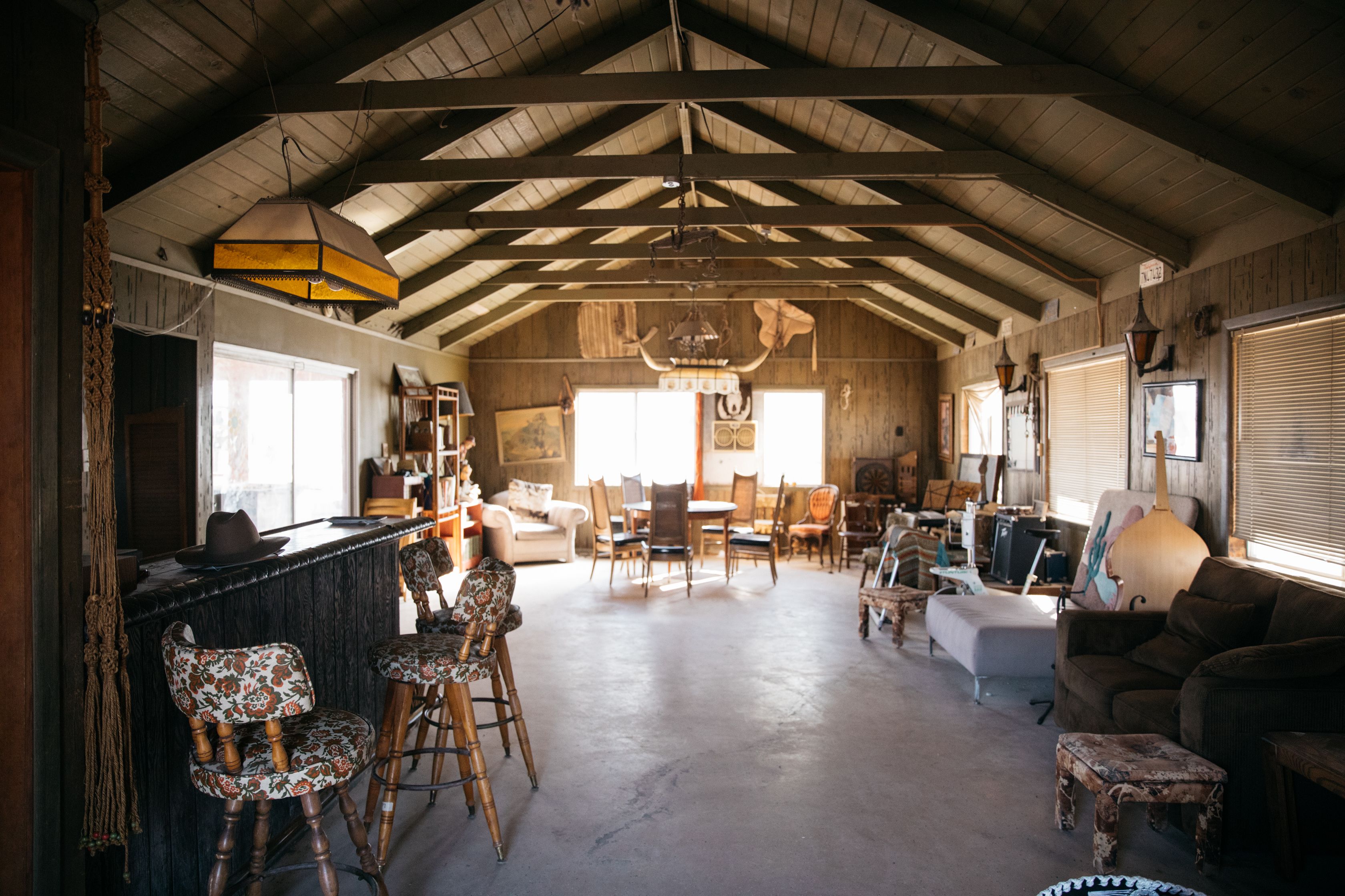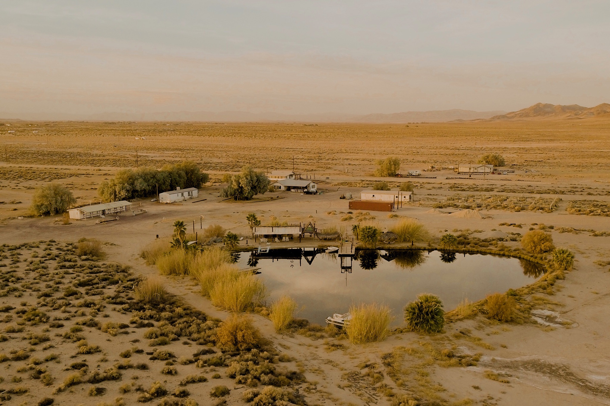 80-acre ranch with over 40 acres of dry lake bed and small dunes, 2 large fire pits, a 1-acre lake with boats and a large shade structure and A-frame, an old style saloon with large kitchen and bathroom, horse stable (no horses onsite currently), old horse corrals, basketball hoop.