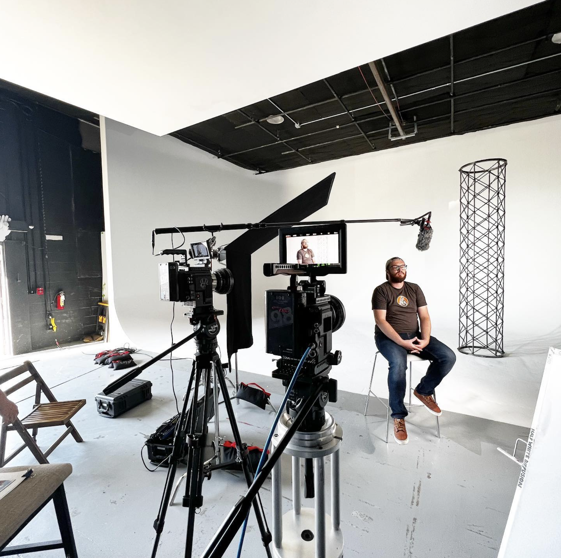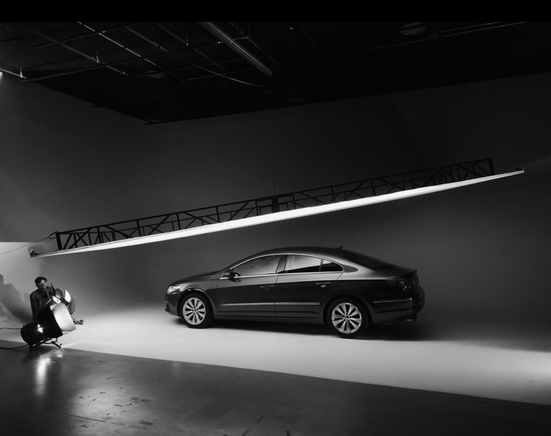 Our studio is a 40'x 60' sq. ft. rectangle with a white 16'x 36' cyclorama on one end. The space has been modified to be quiet and sound tight for film/video recordings. We have a grid in the 16 ft. ceiling above the cyc for hanging lighting. A very unique feature of our studio is the white flat bounce suspended in the ceiling. The 10'x26' bounce can be positioned about anywhere in the studio, as it slides on a 40ft track and has a winch to lower or raise it to your desired height.