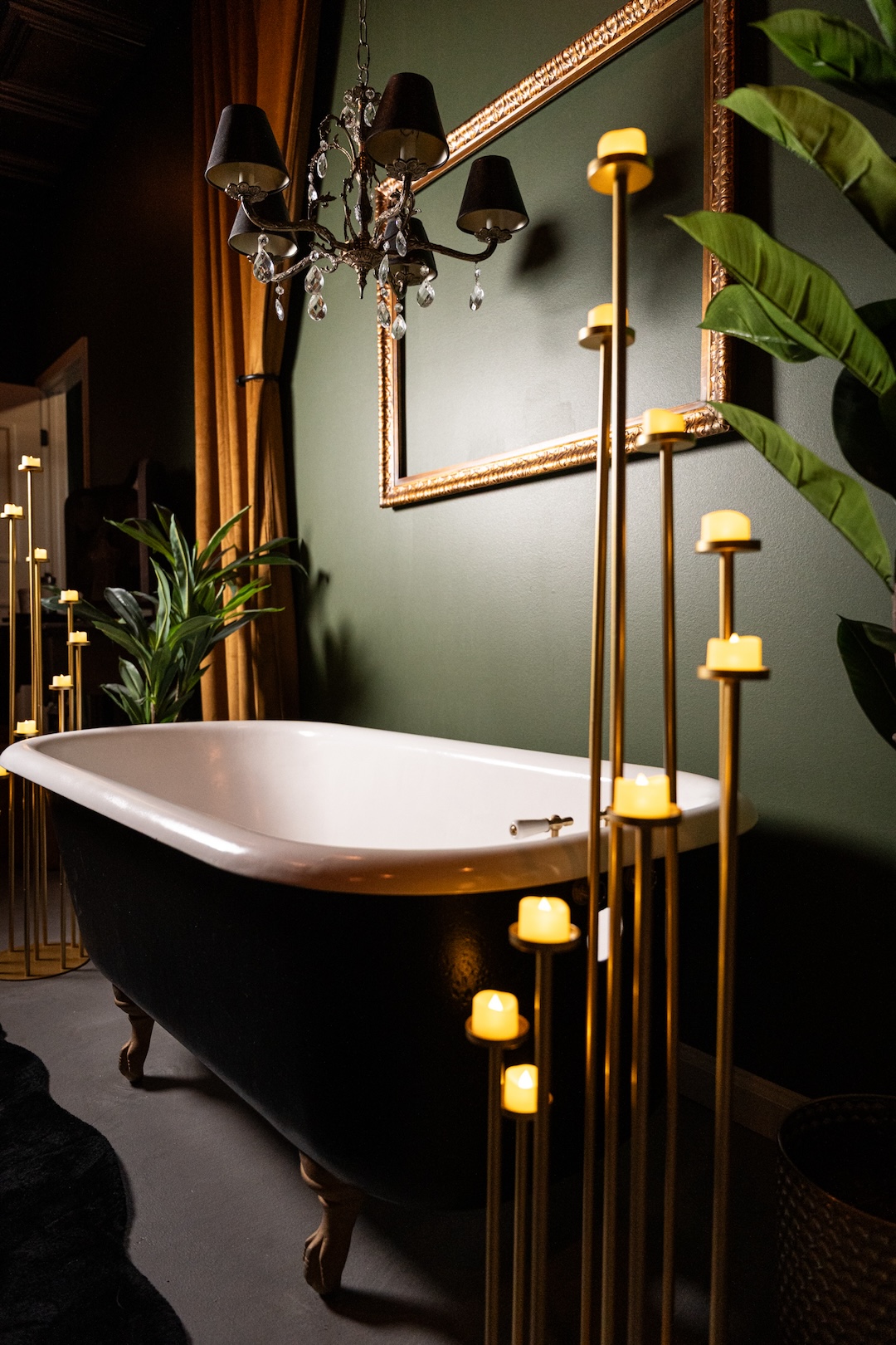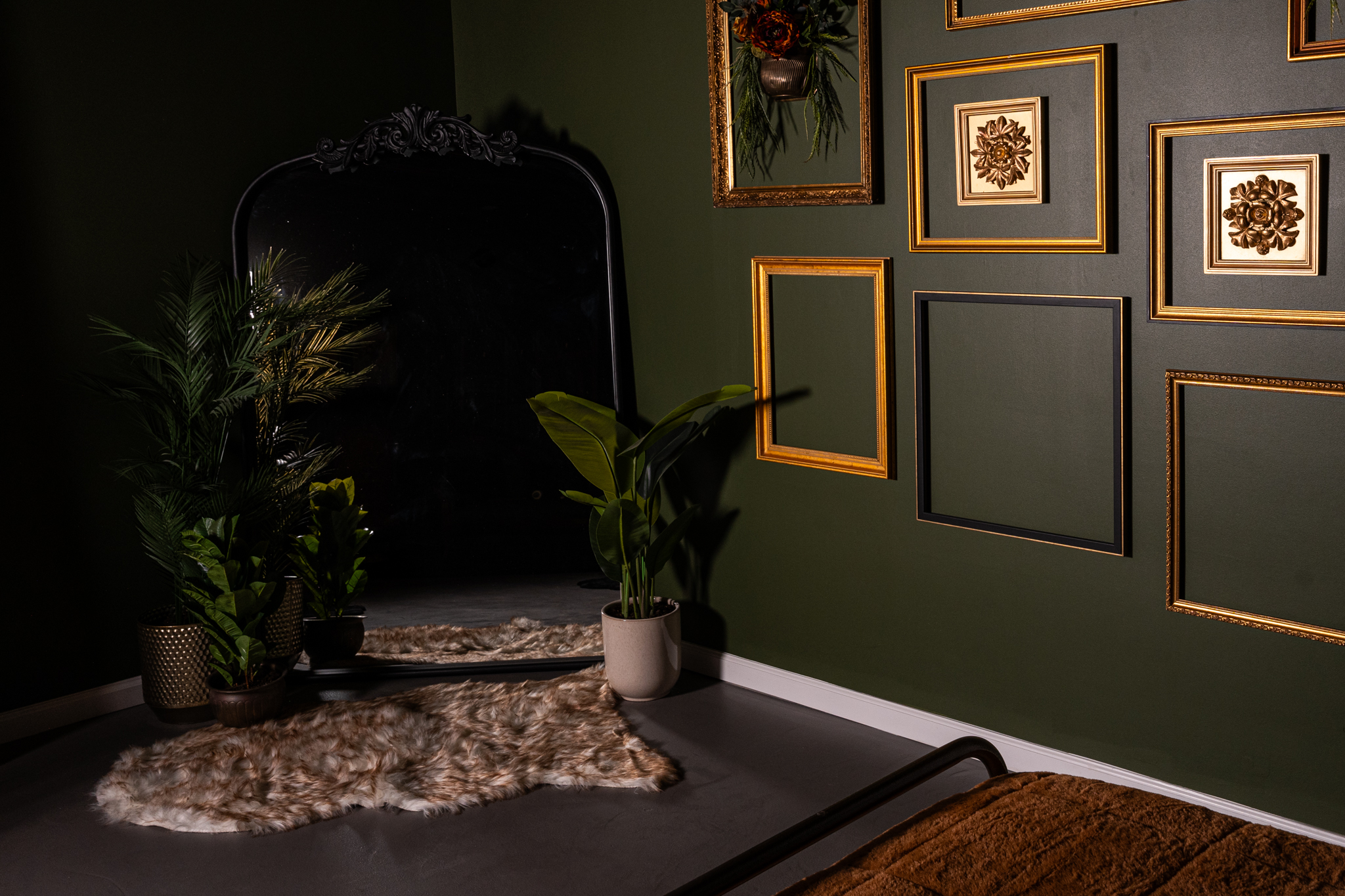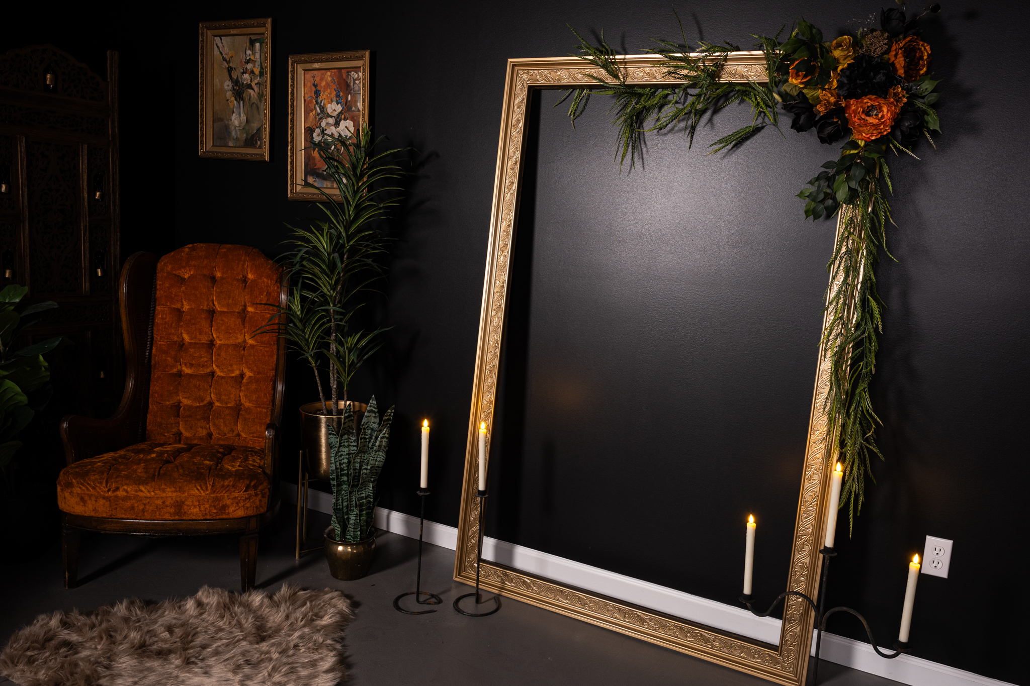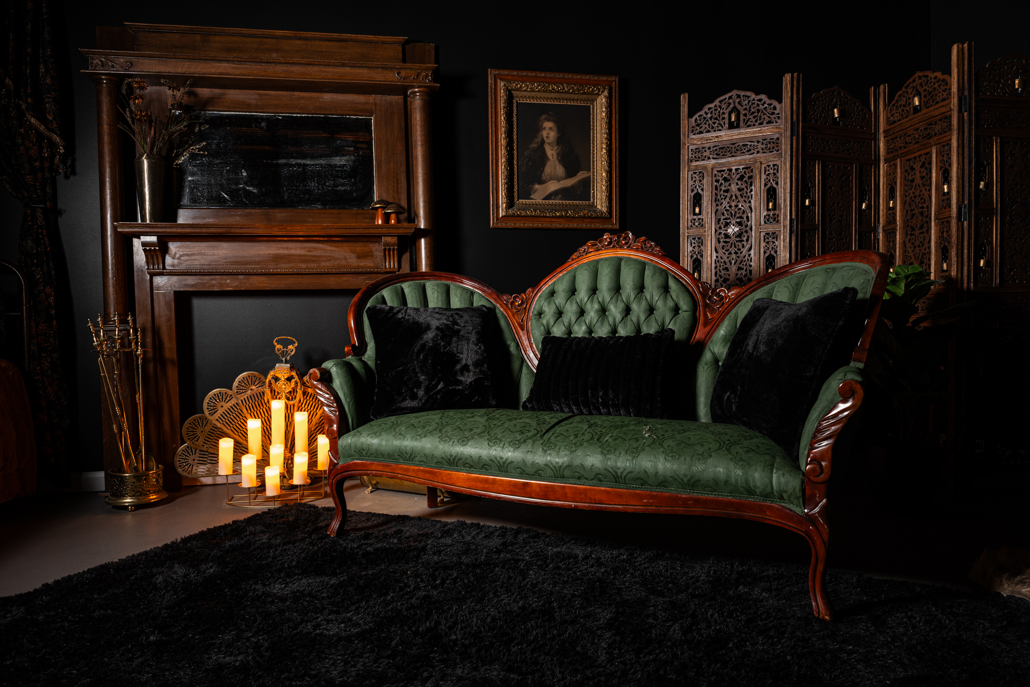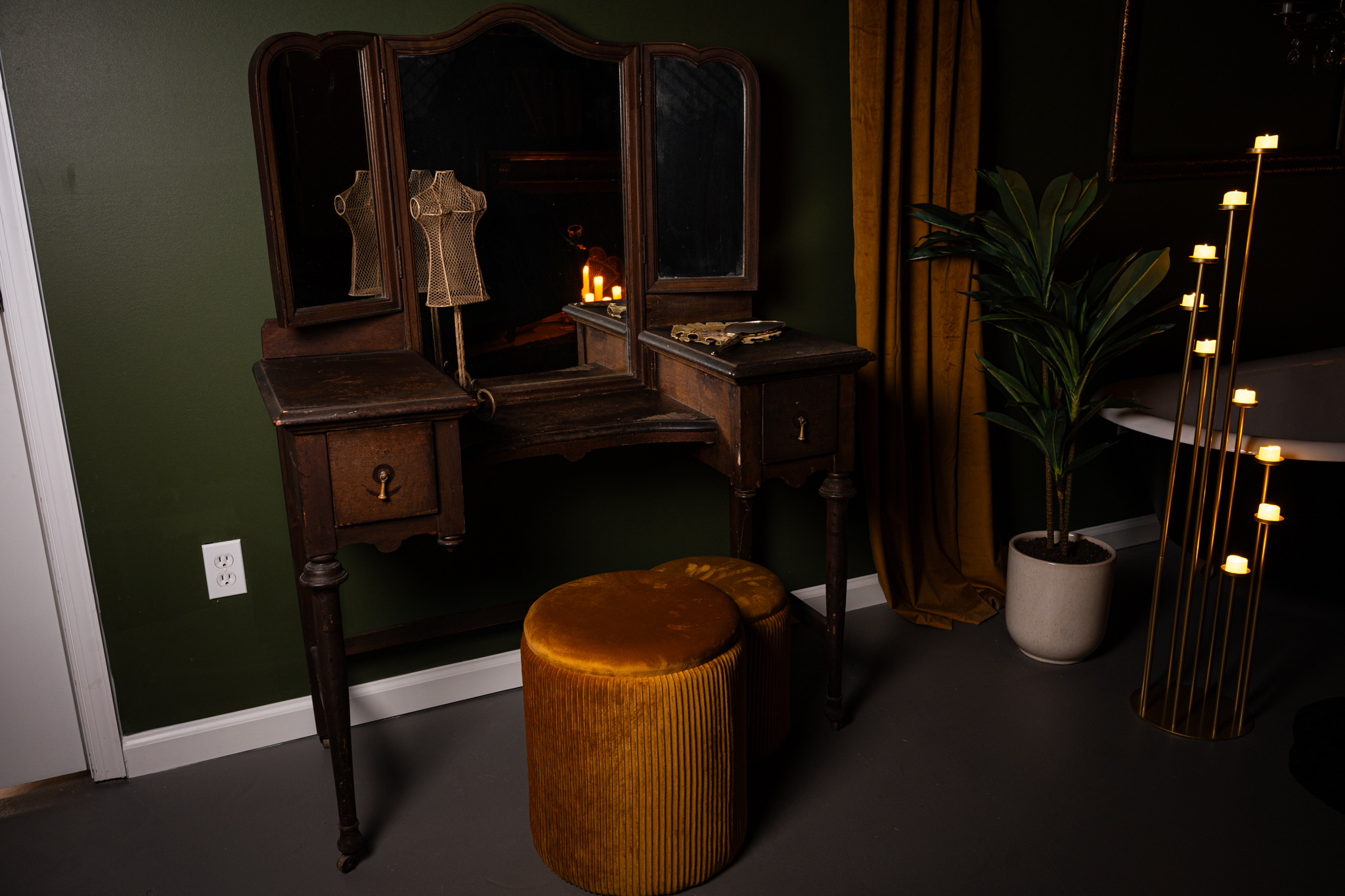 Step into The Void: a dark, moody studio in Virginia Beach, blending vintage luxury with modern function. Think: Victorian loveseat, 1800s mantle, antique vanity, grand mirror, and queen metal bed. Set against deep green + black walls with faux brass ceiling, dimmable lighting, pro softboxes, and endless inspiration. Perfect for photographers craving depth, drama, and cinematic vibes.