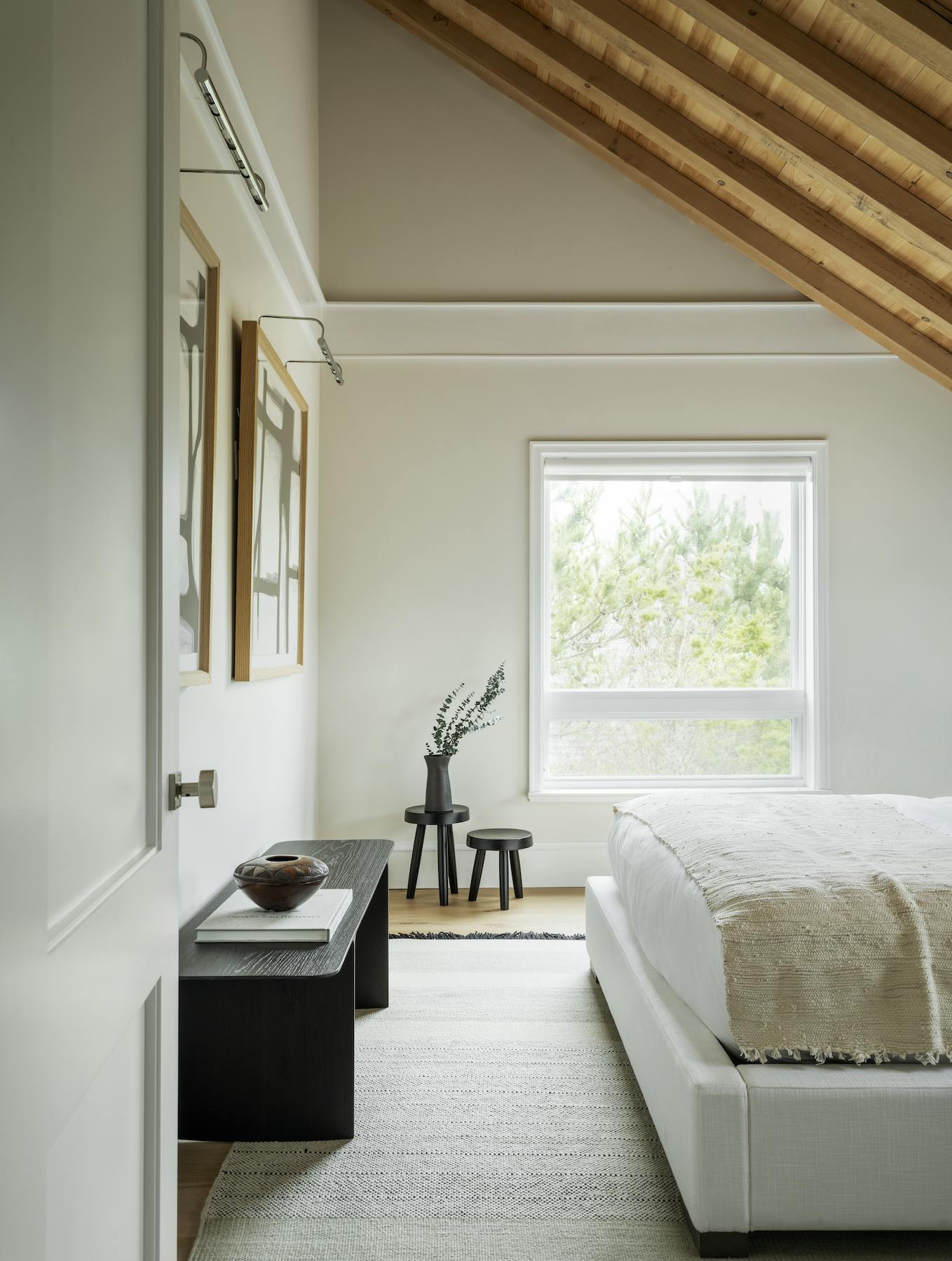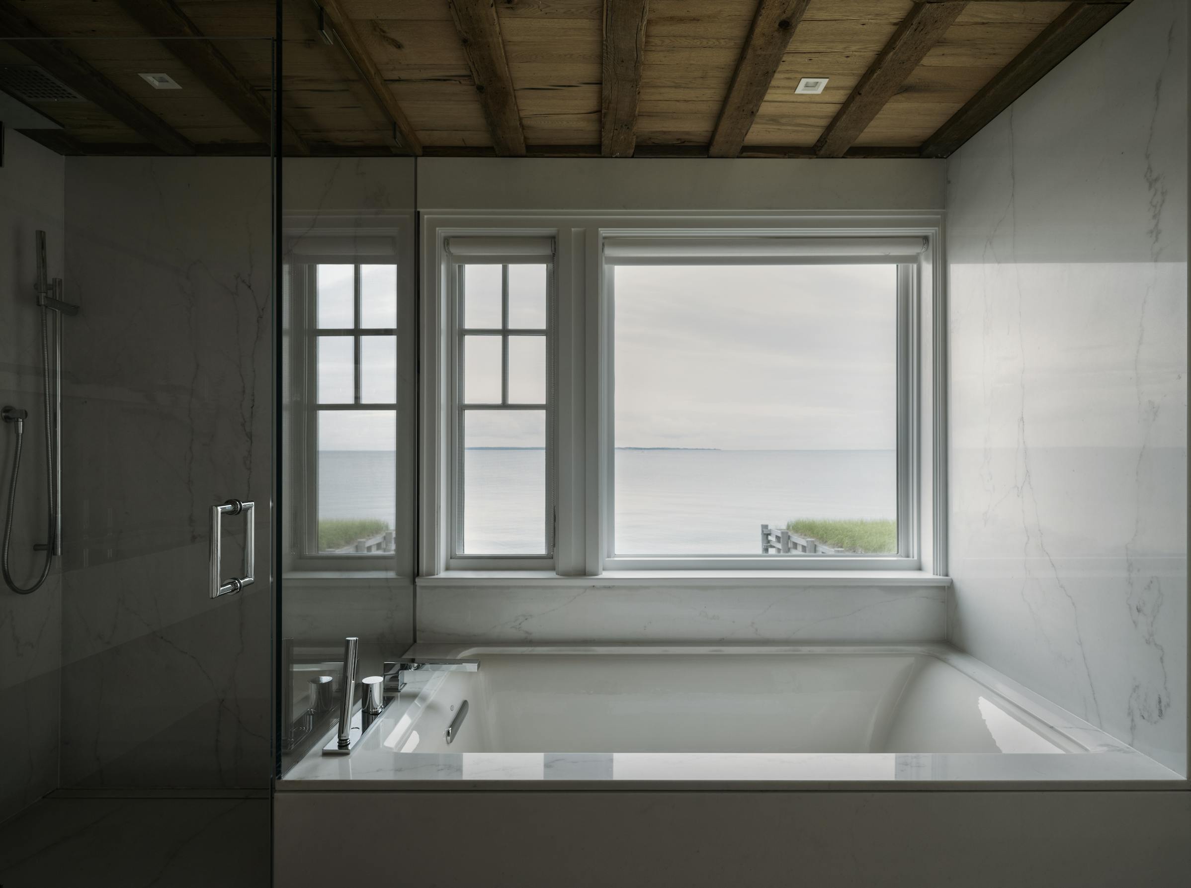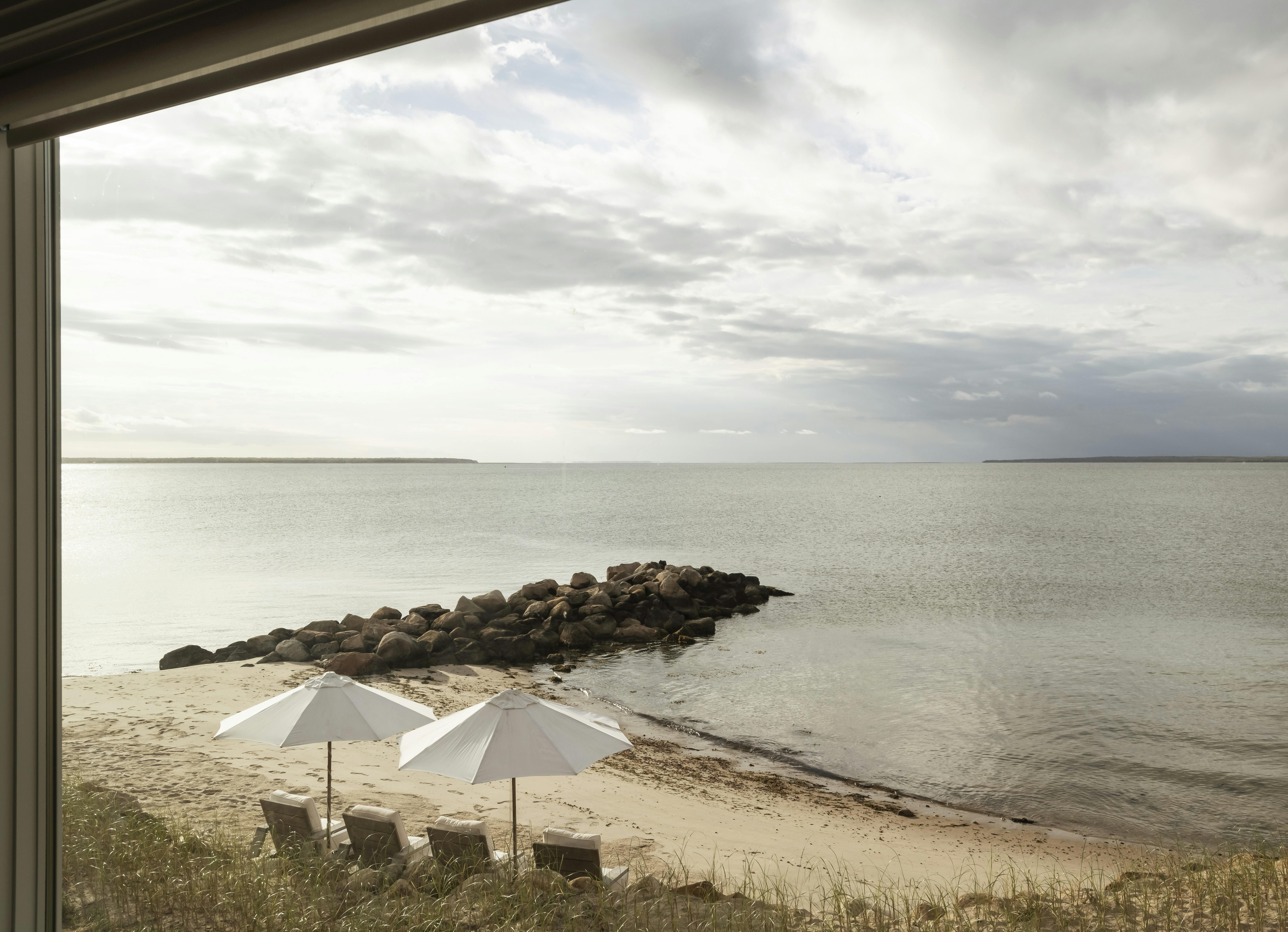 Perched on the water's edge, this waterfront house features a timeless design and the luxury of a private beach overlooking the tranquil Gardiners Bay. The interior is modern and airy, featuring vaulted wood ceilings that create great depth and texture.