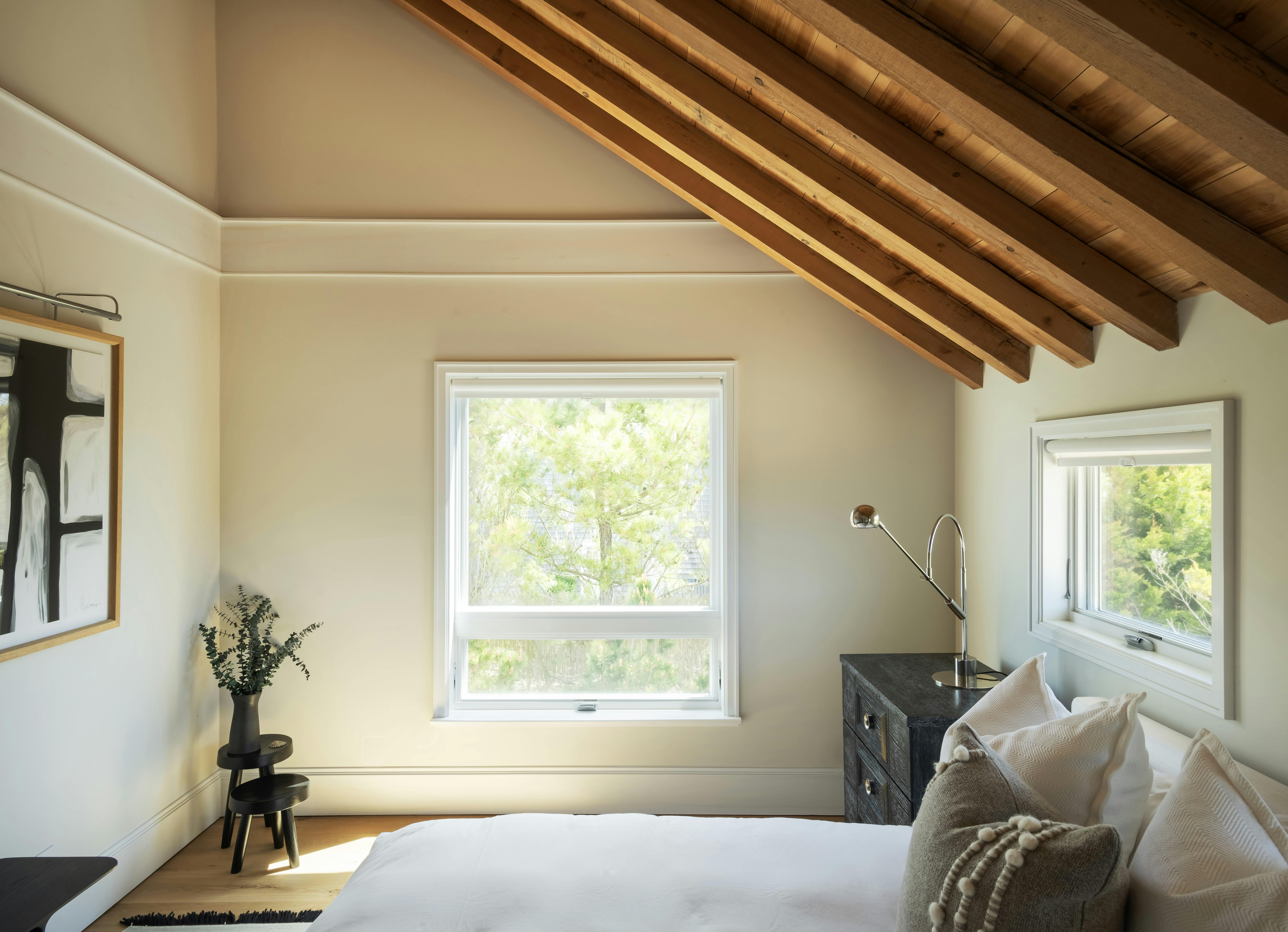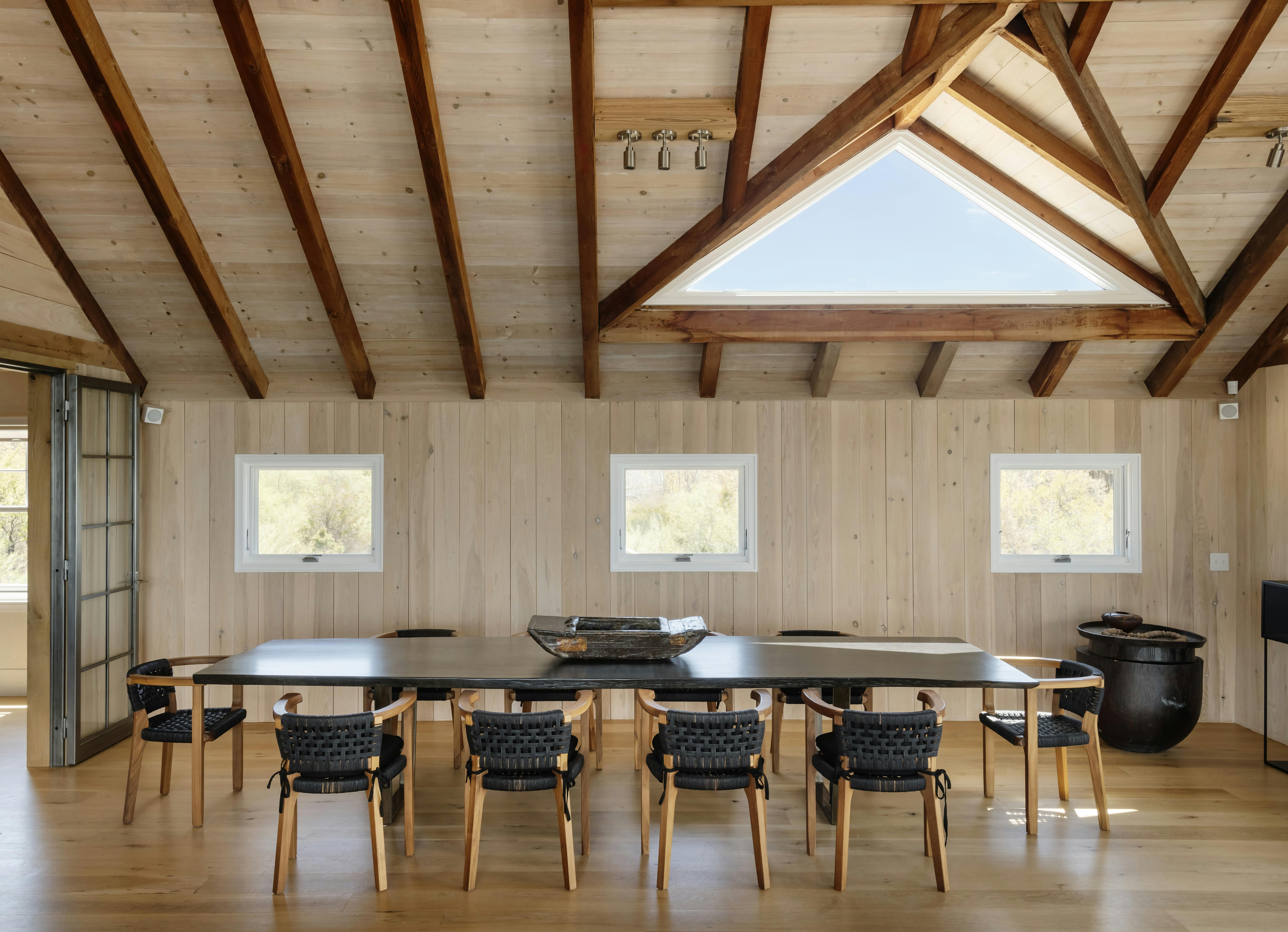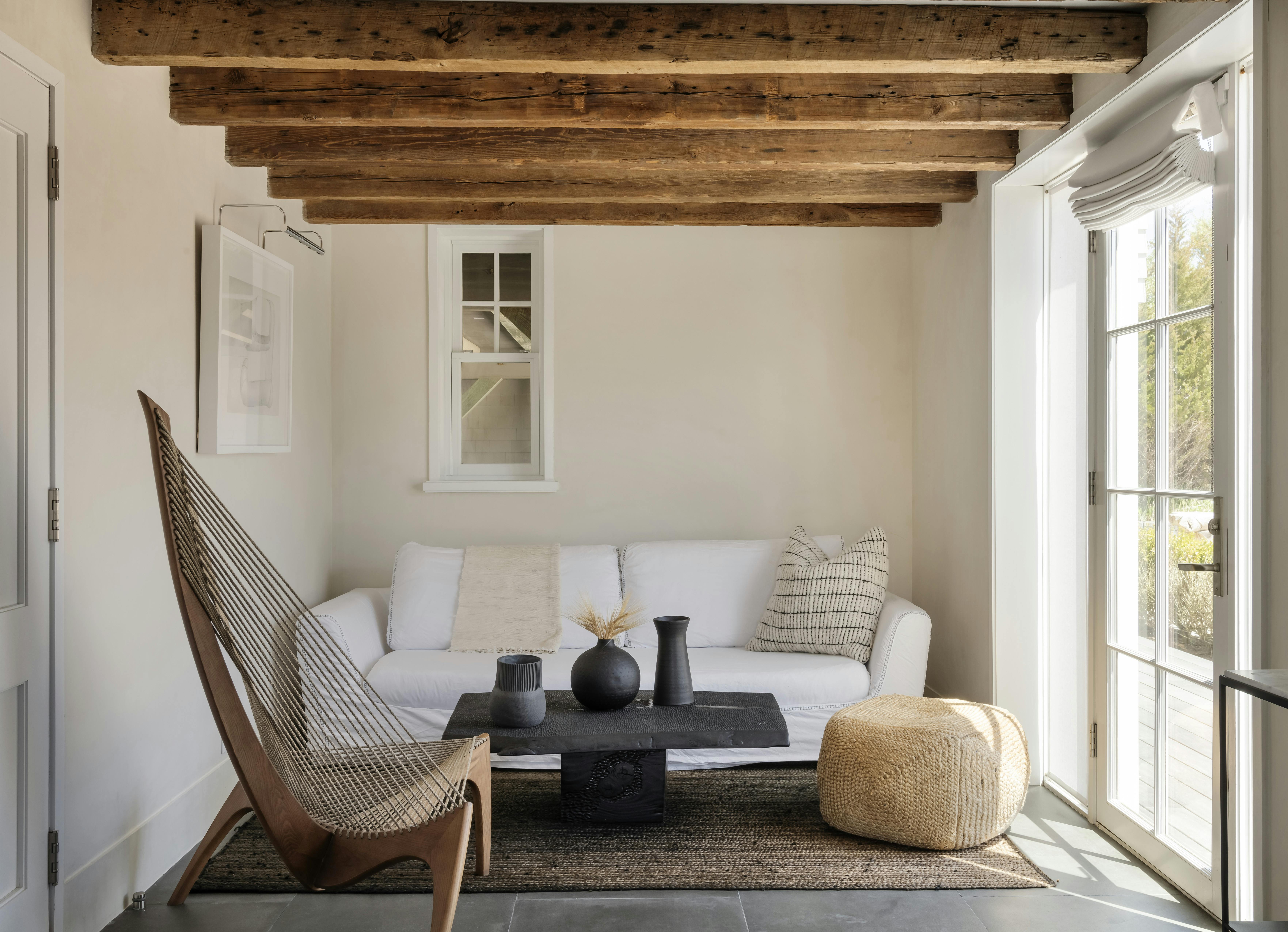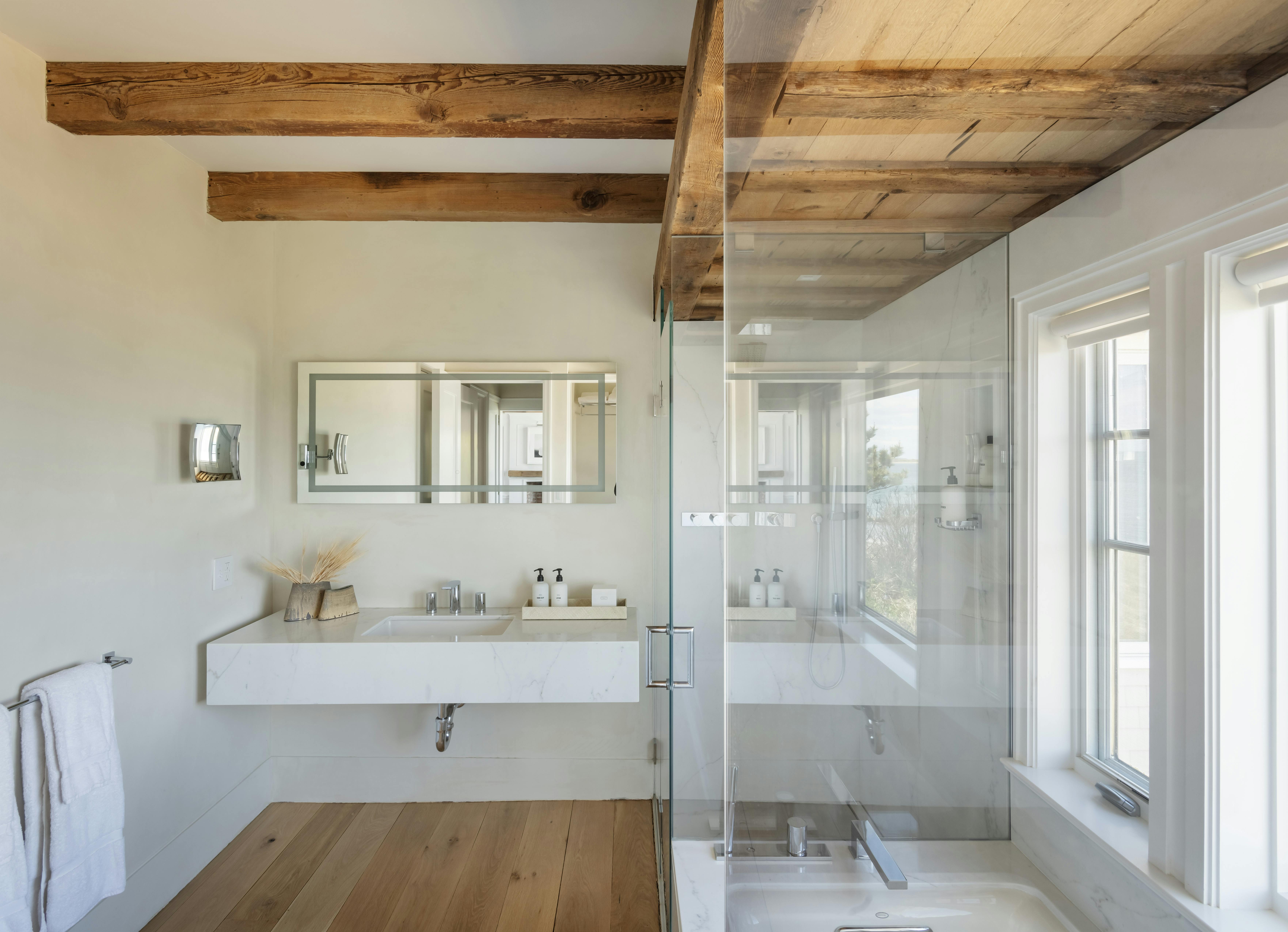 Perched on the water's edge, this waterfront house features a timeless design and the luxury of a private beach overlooking the tranquil Gardiners Bay. The interior is modern and airy, featuring vaulted wood ceilings that create great depth and texture.