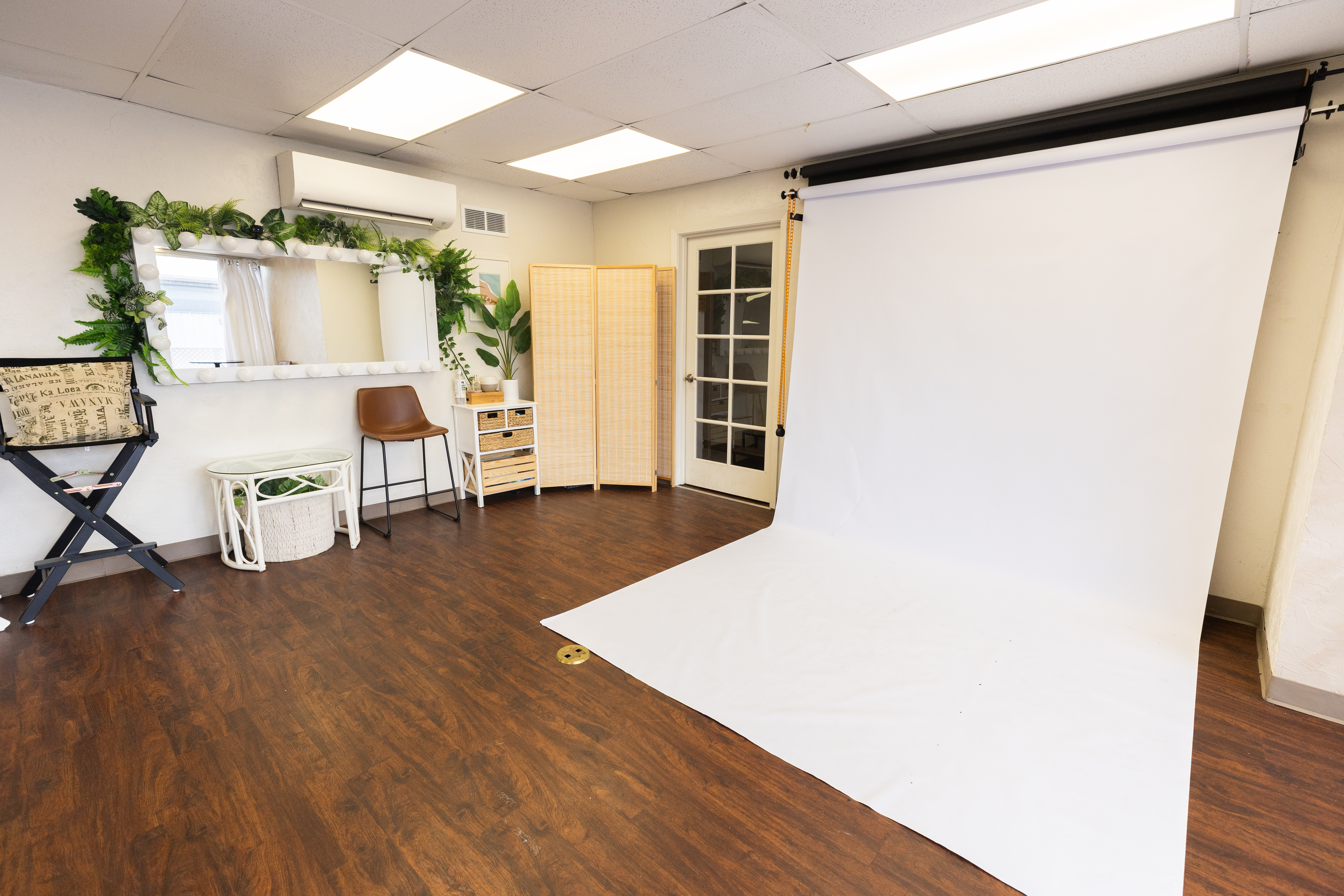Professional lighting, backdrops, hair and makeup area, and ready-to-use gear, available for rent. Every rental include white and black paper backdrop.