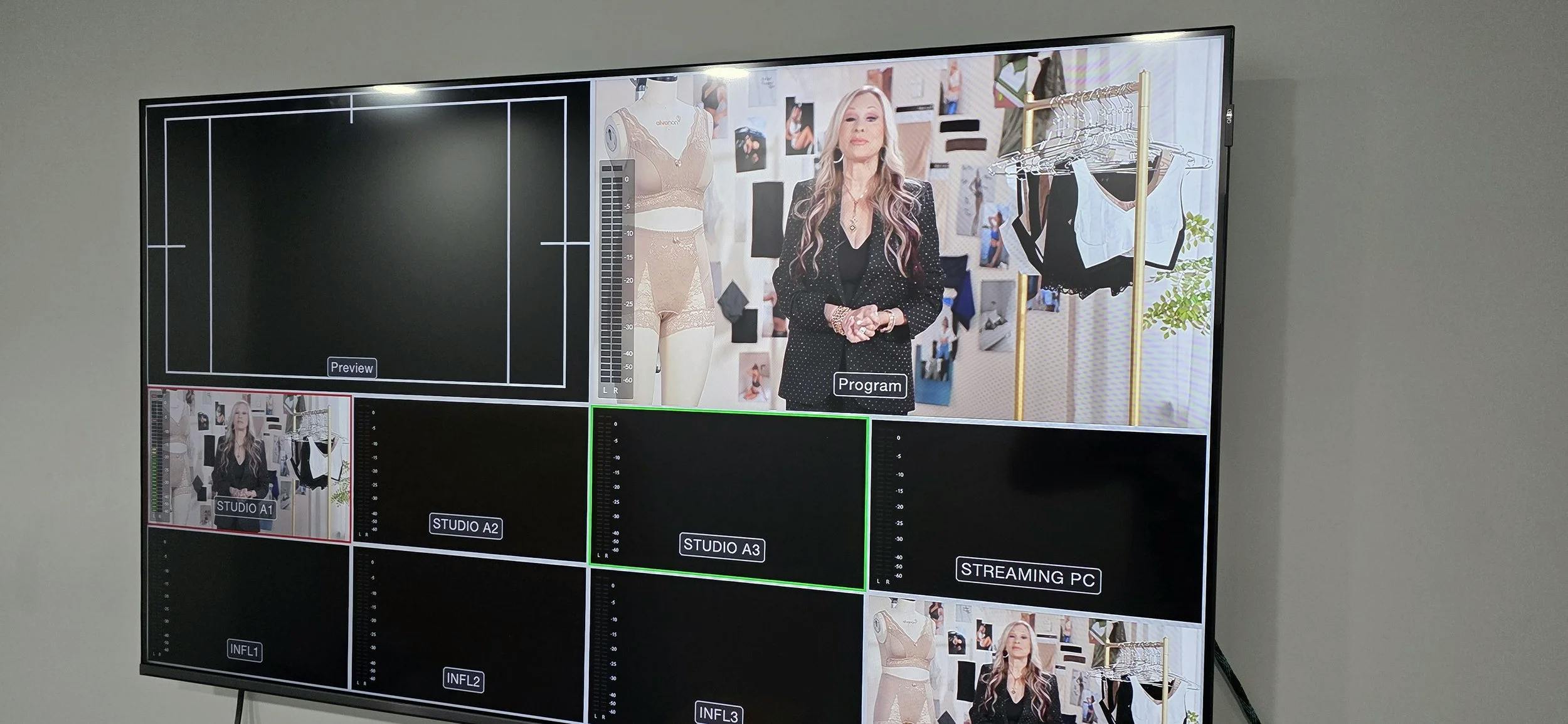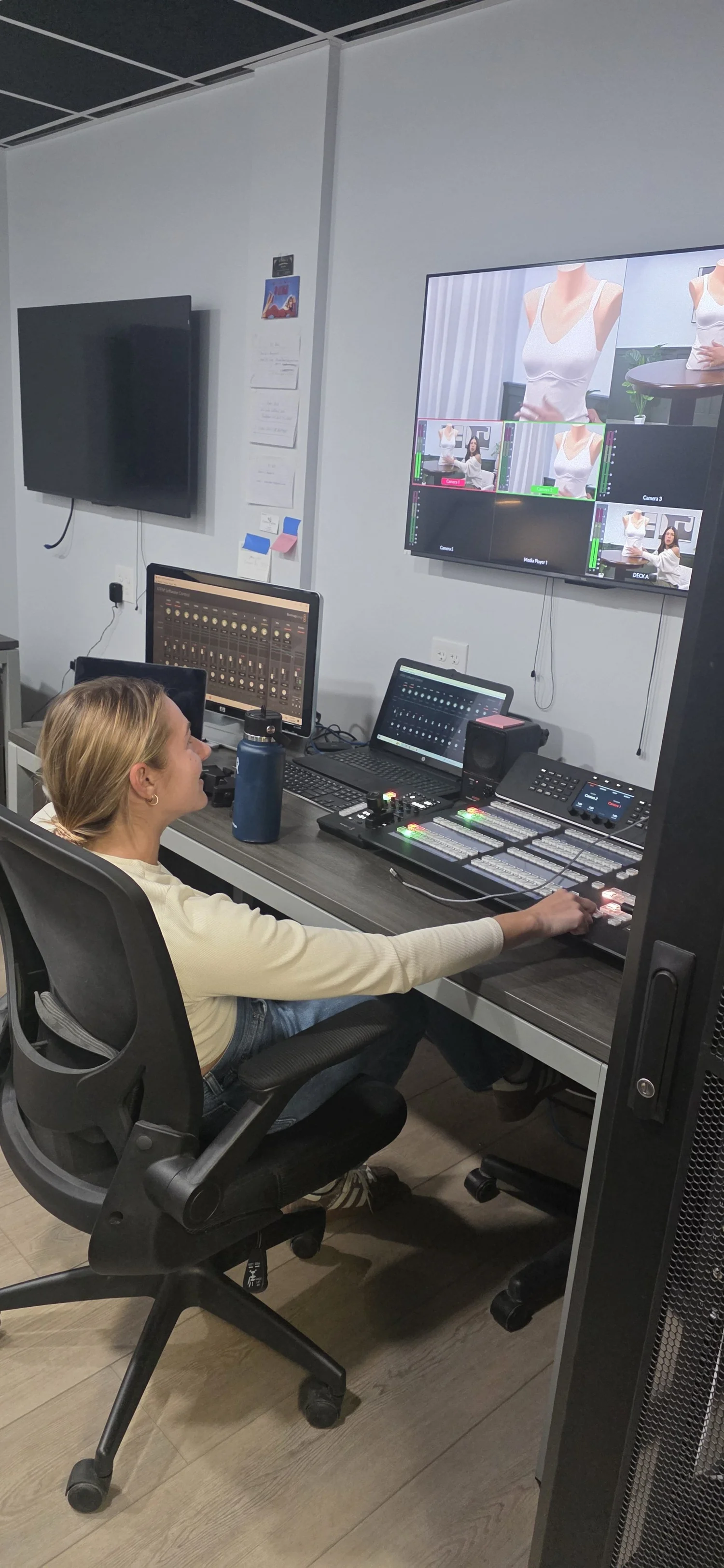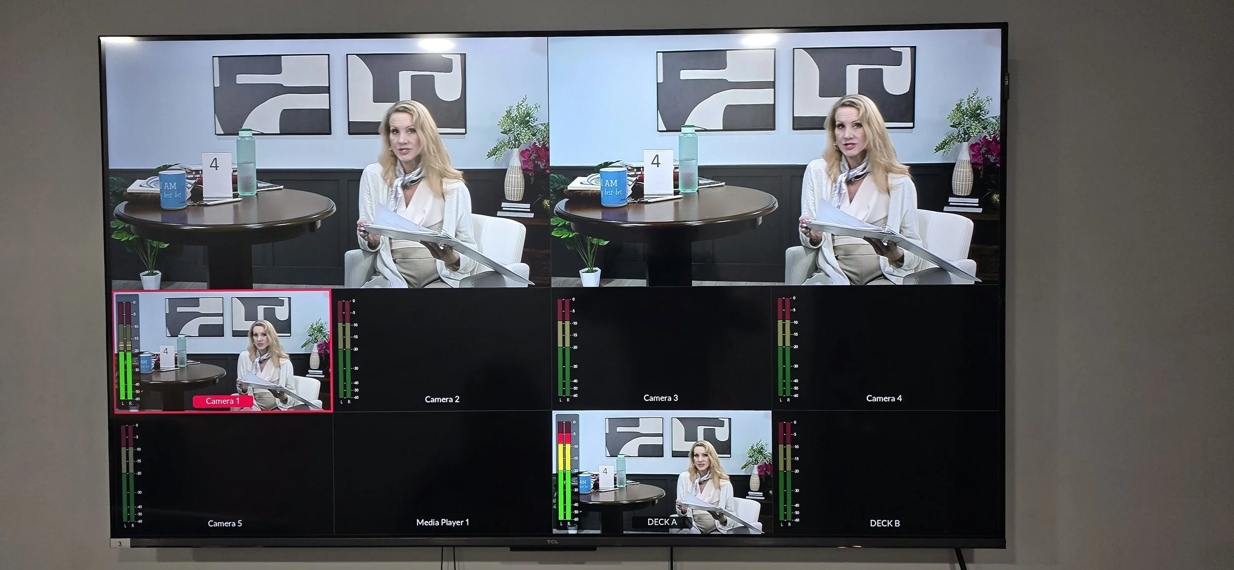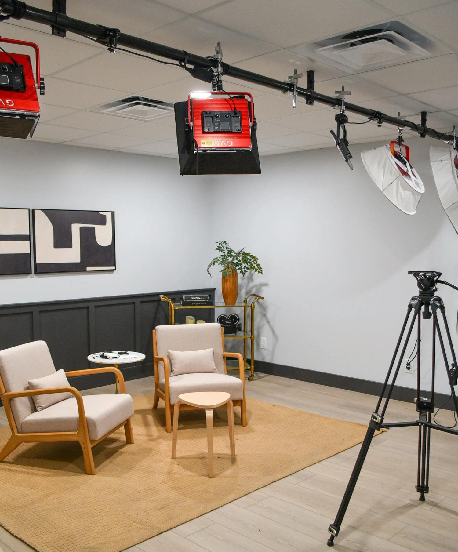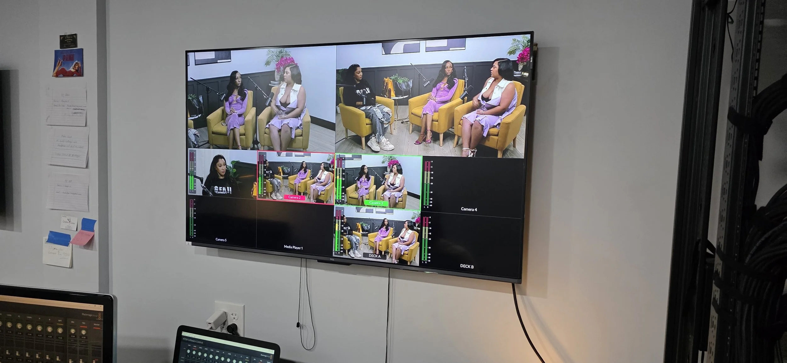 HD and 4K cameras. Lighting, Audio Gear, Sets, Furniture, Props, Full Control Room, Video Switchers, audio mixers.