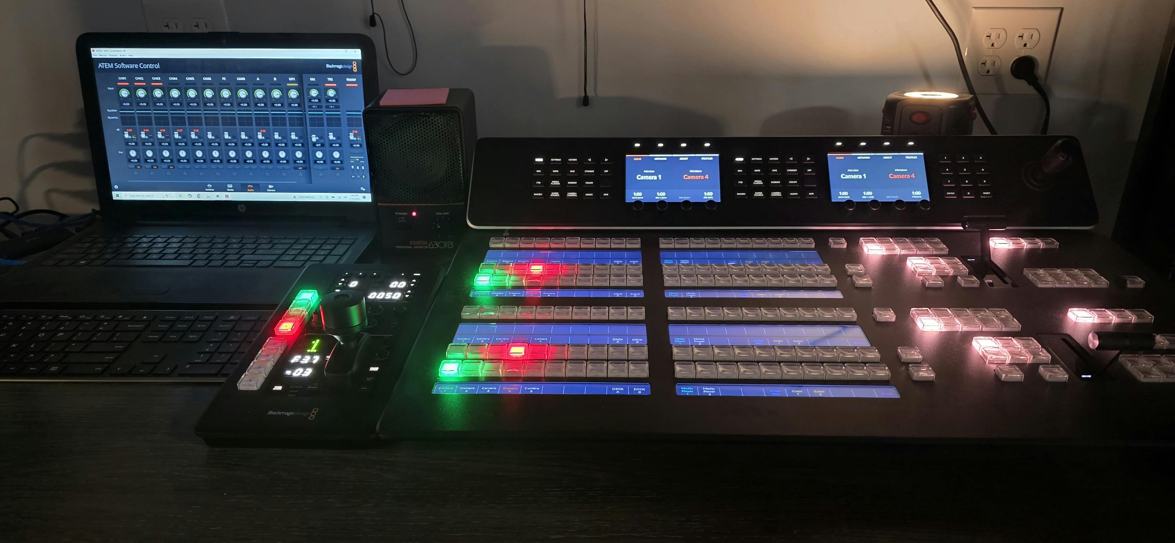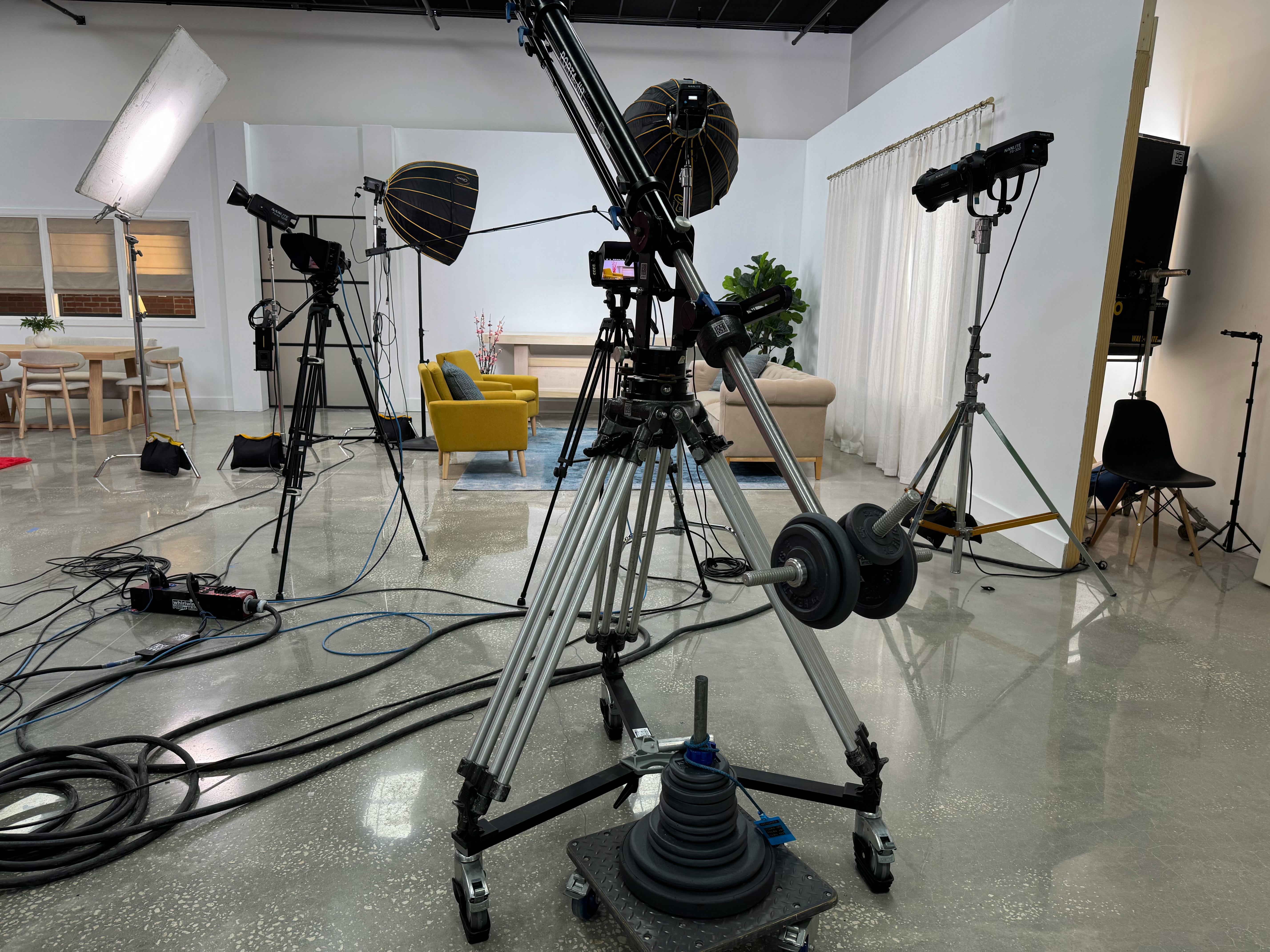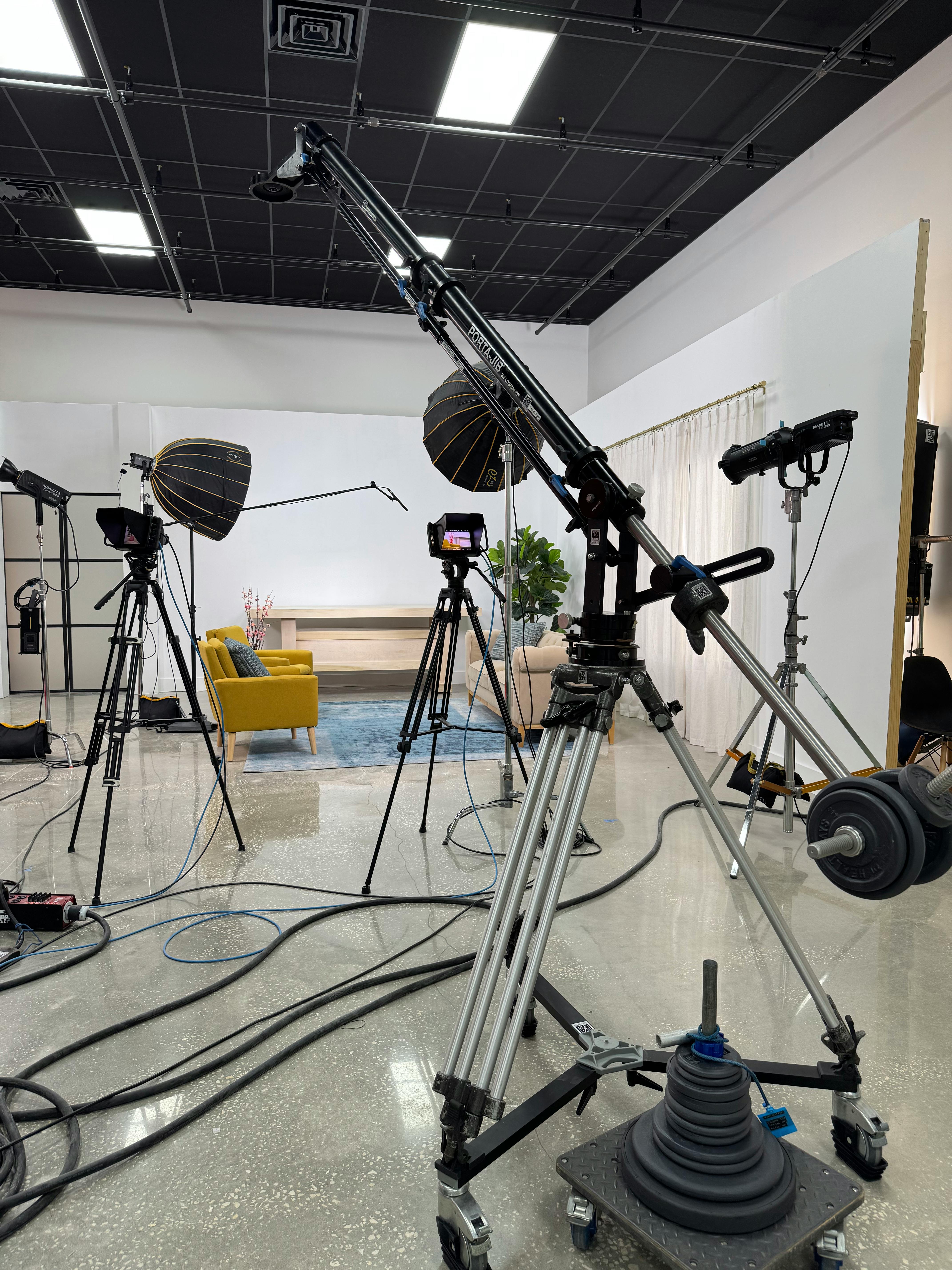 Lighting grid and full control room, including audio mixers, video switchers, and Blackmagic workflow (record decks, scopes). Includes cyclorama, lighting boards, and access to lighting grid. Cameras, lighting, grip, and electric available for rent. Prebuilt standing sets, set walls, props, and furniture available.