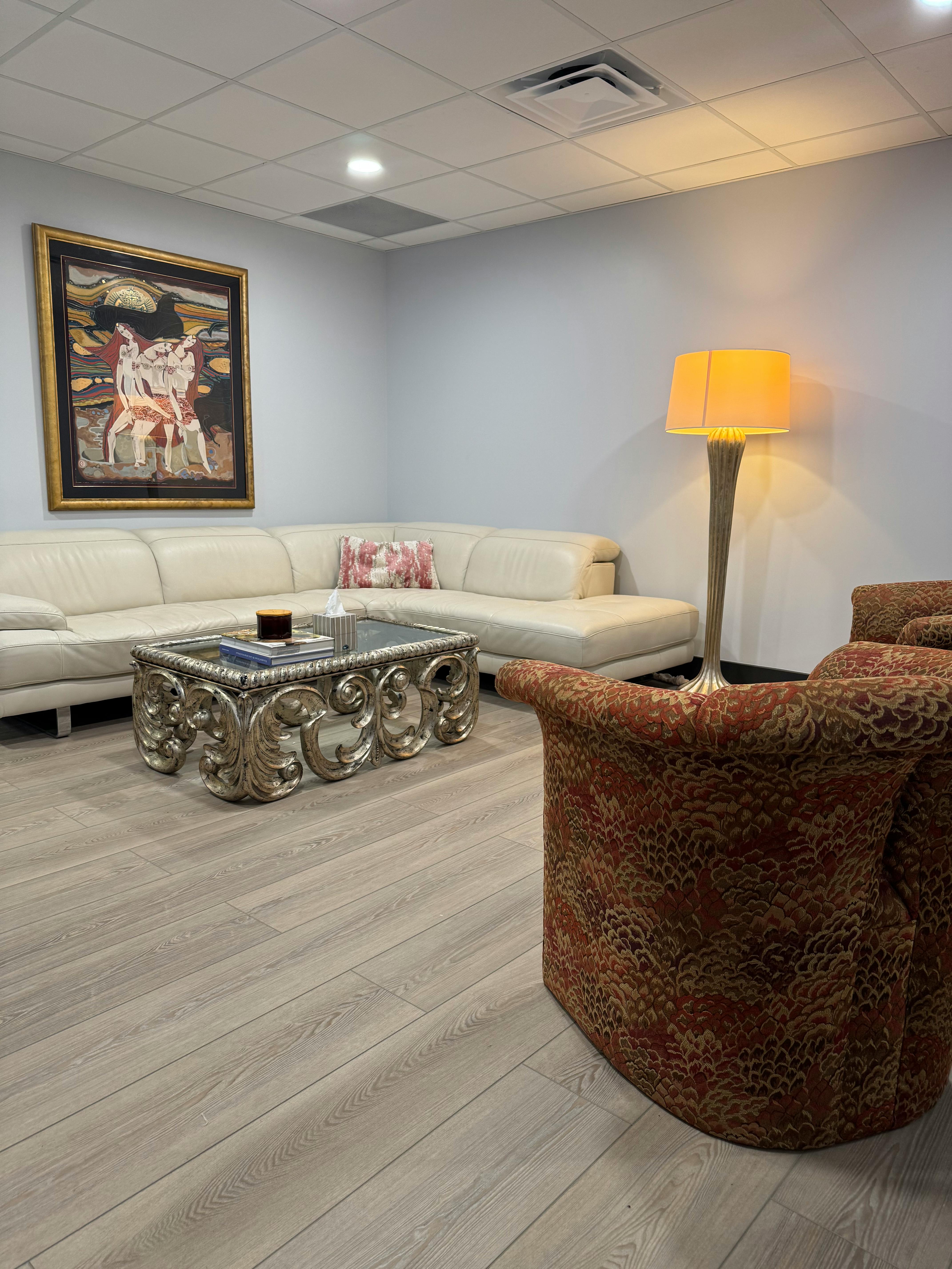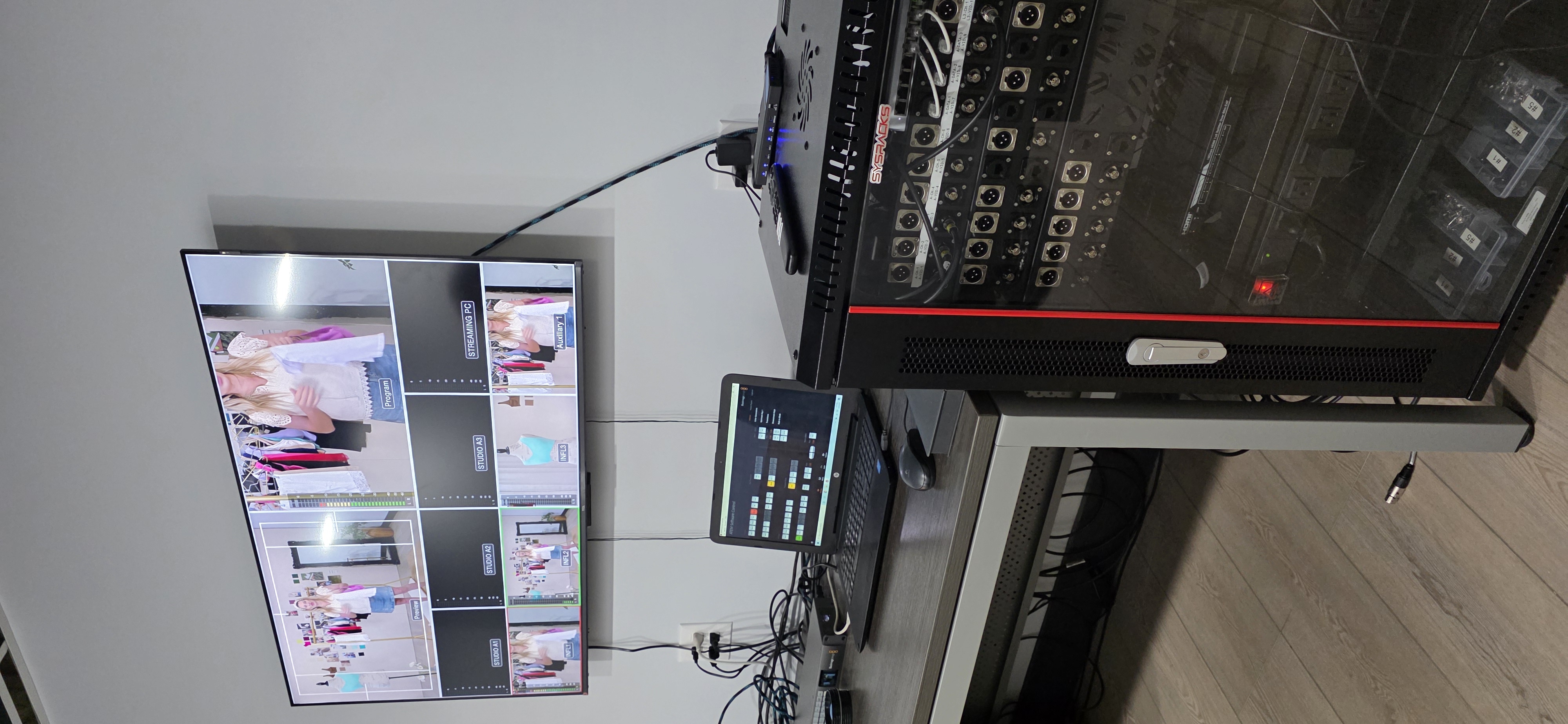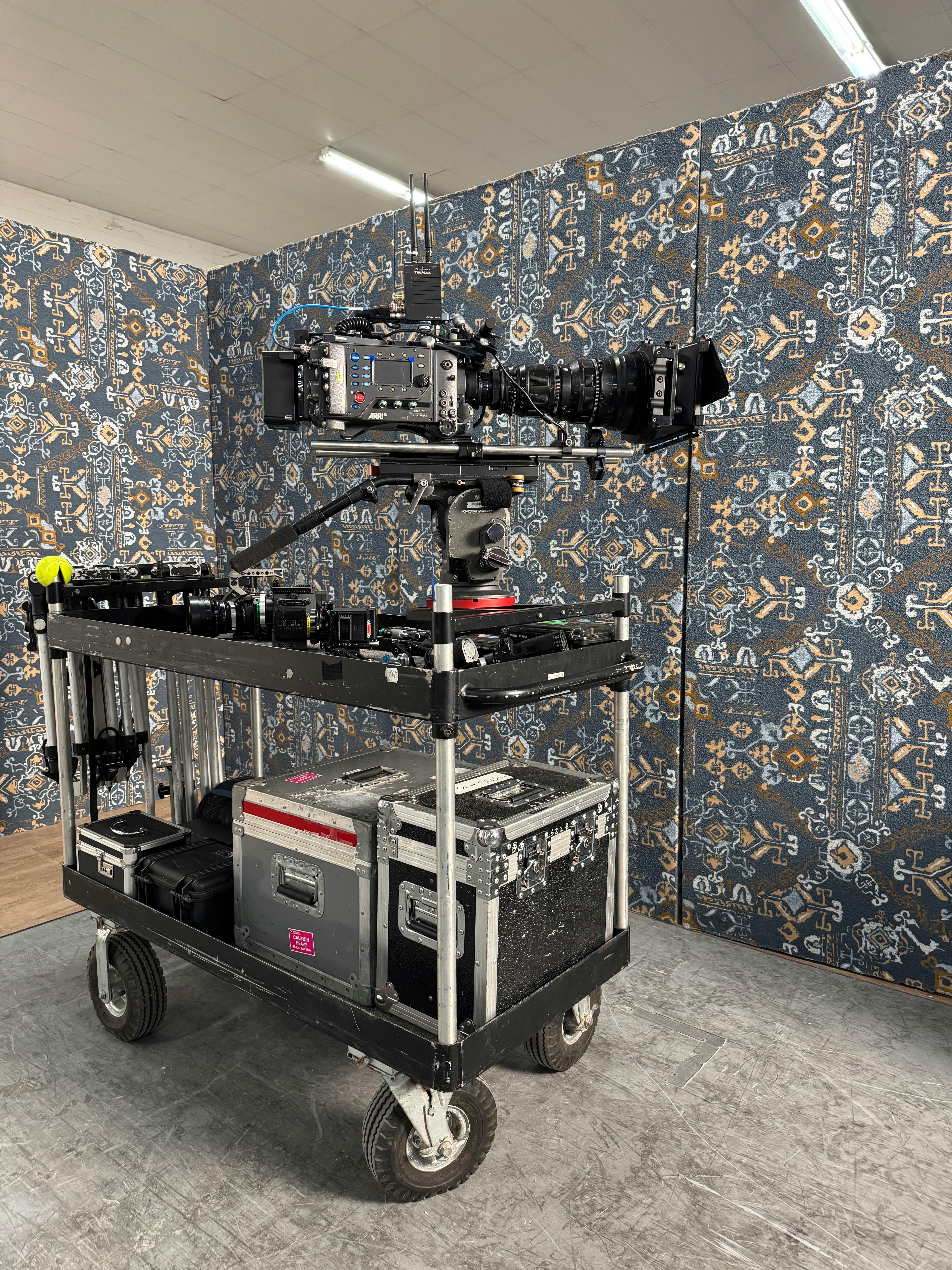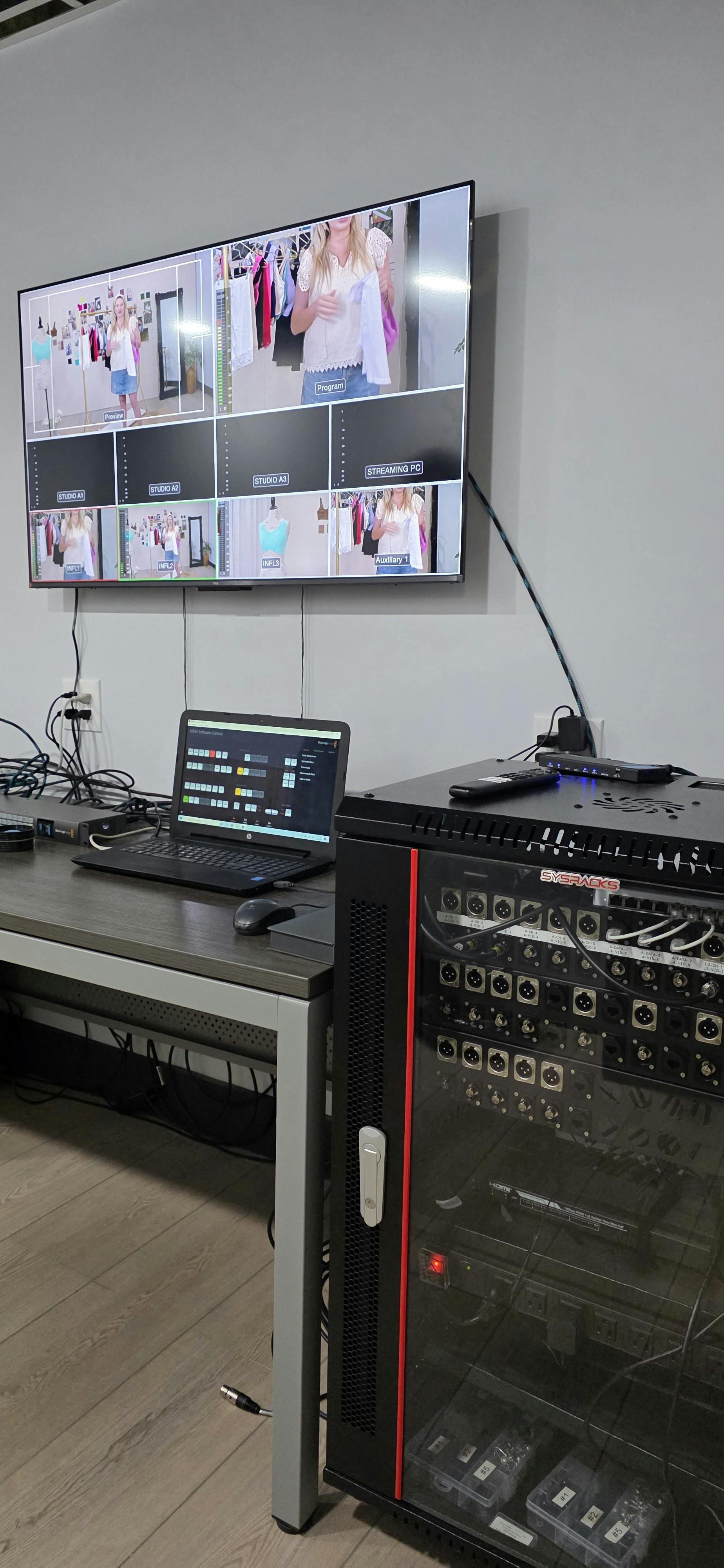 Lighting grid and full control room, including audio mixers, video switchers, and Blackmagic workflow (record decks, scopes). Includes cyclorama, lighting boards, and access to lighting grid. Cameras, lighting, grip, and electric available for rent. Prebuilt standing sets, set walls, props, and furniture available.