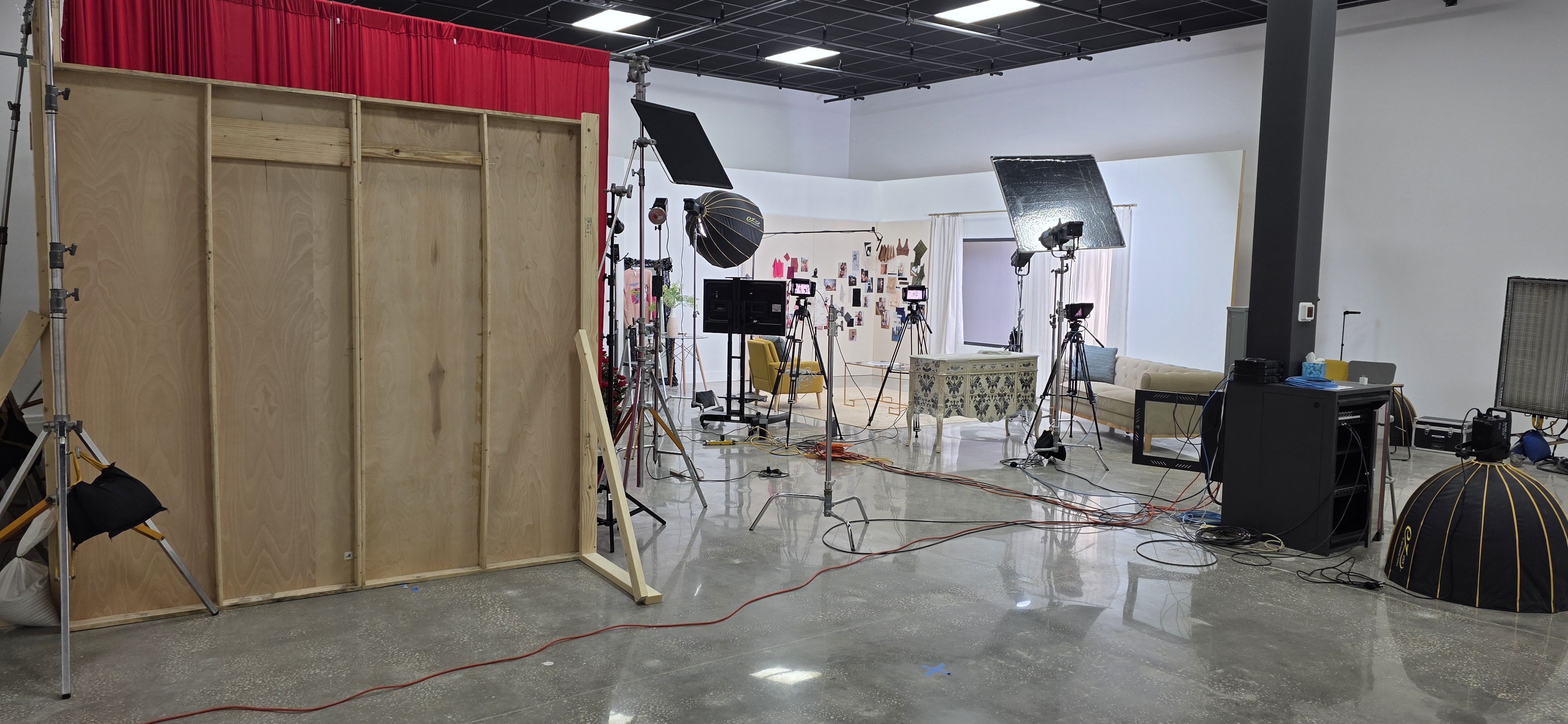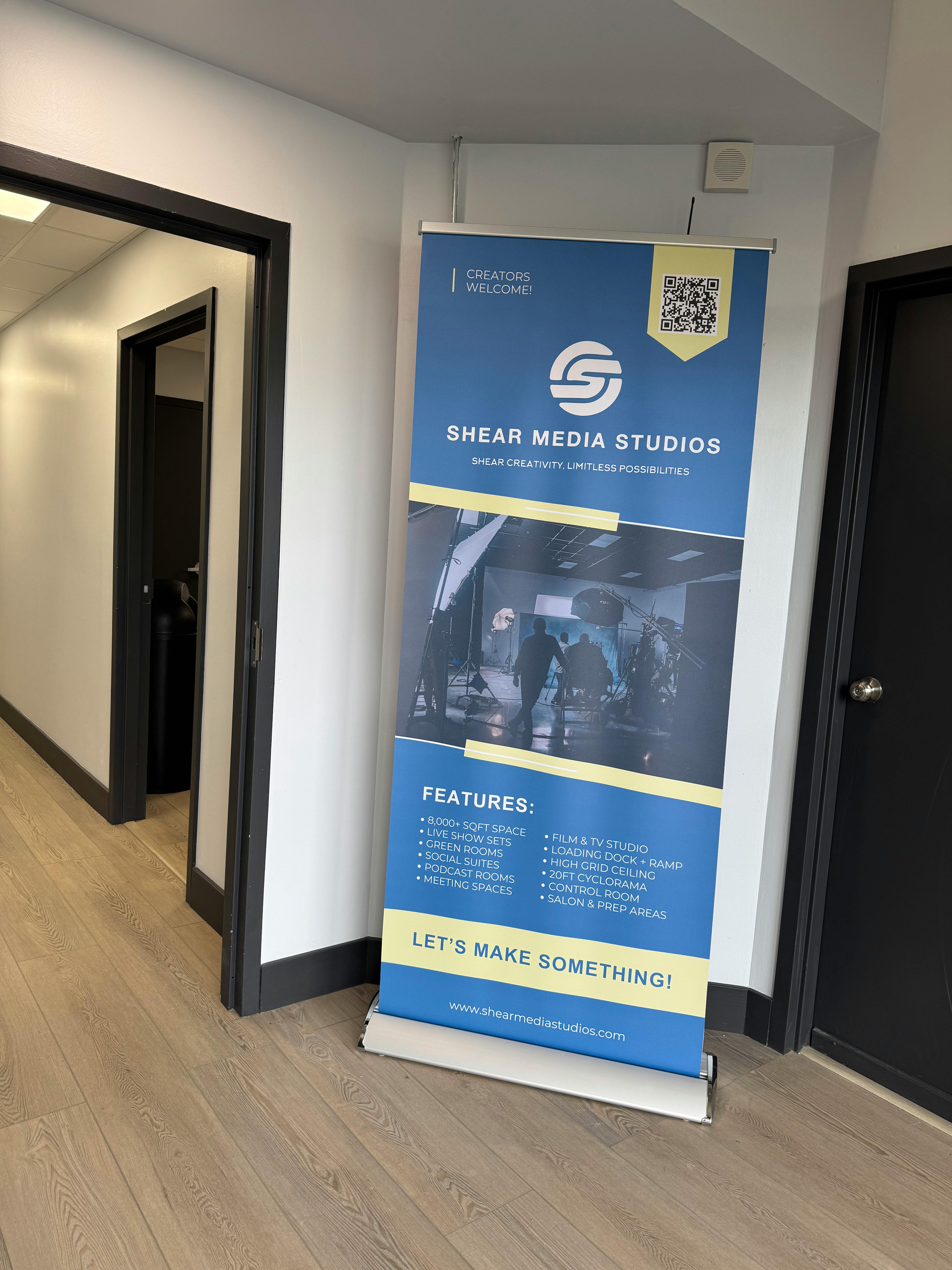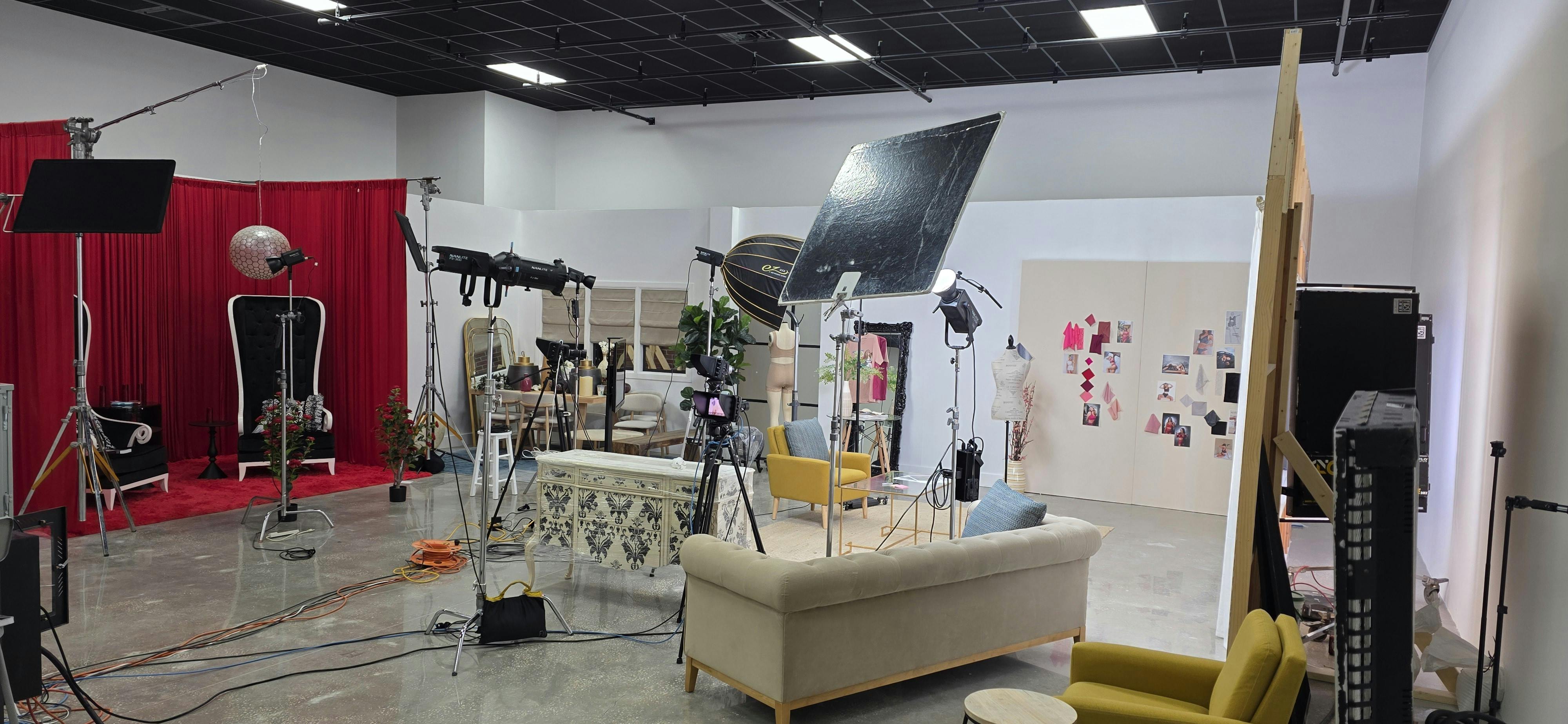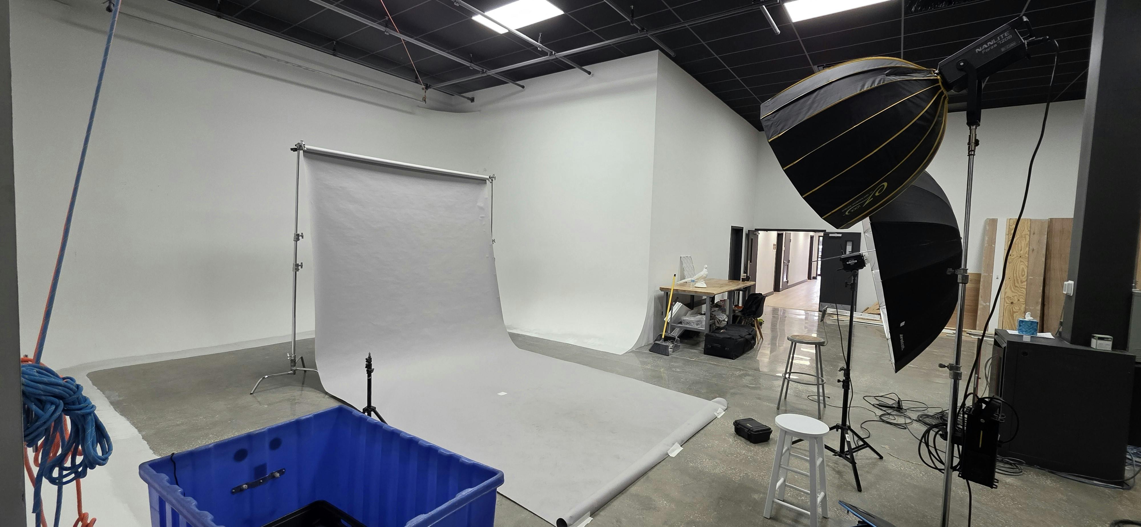 Shear Media Studios offers two production stages under one roof. Studio A is a 2800 sq/ft controlled space ideal for interviews, podcasts, large commercials and live streaming, featuring a white cyclorama, lighting grid and control room access. Studio G is a 5,600 sq ft open stage with a full lighting grid, bay door access, and room for set builds, events, and large-scale productions.