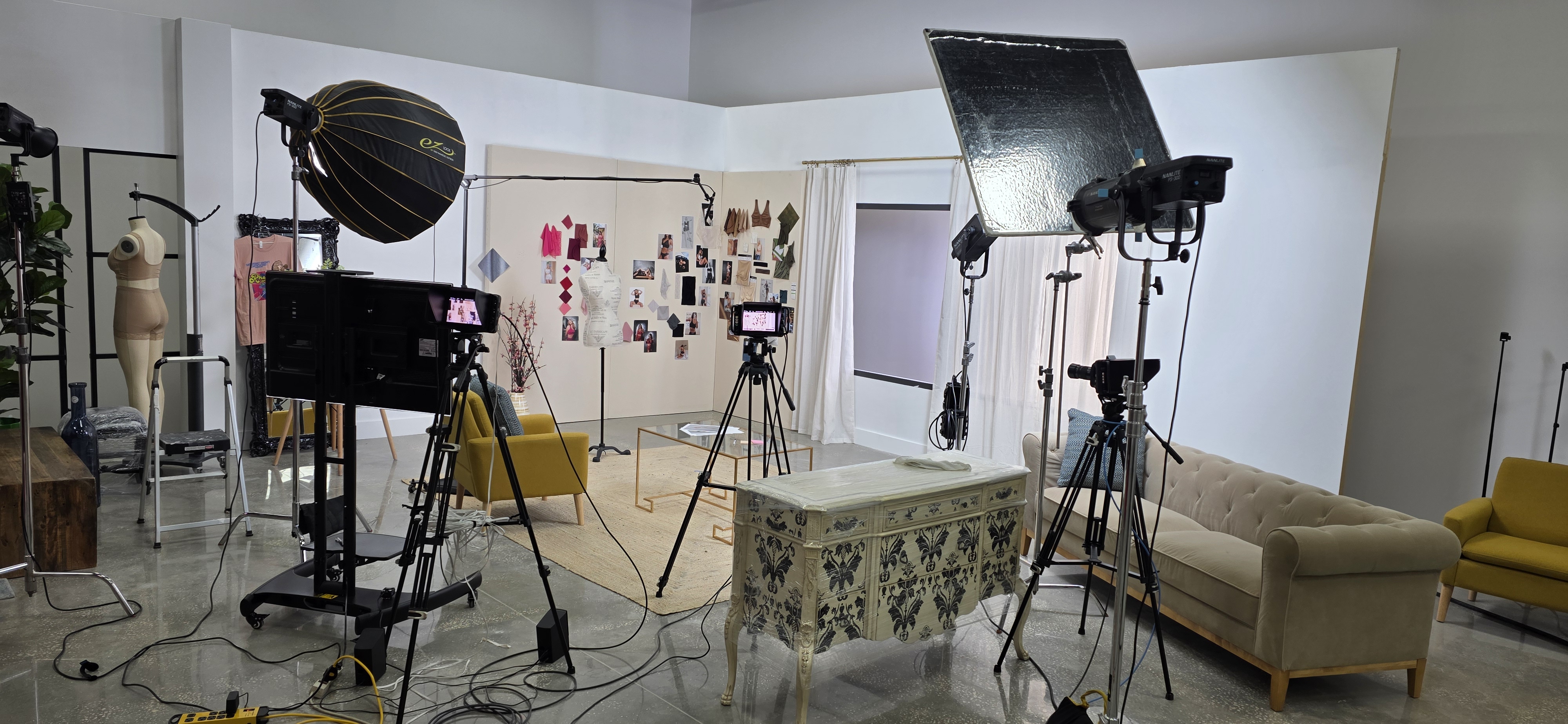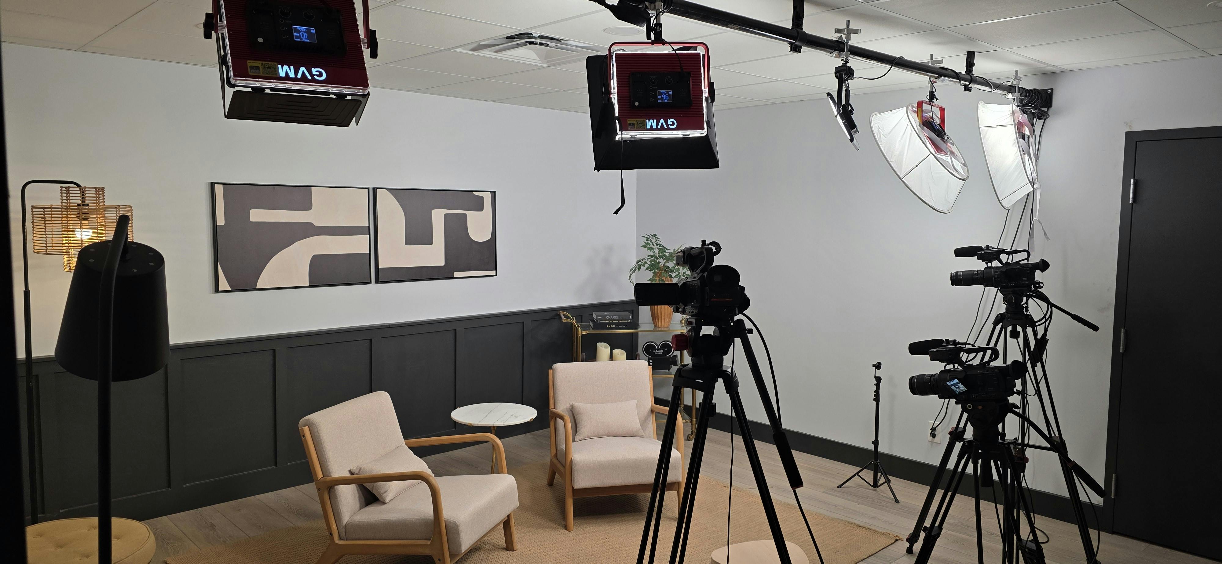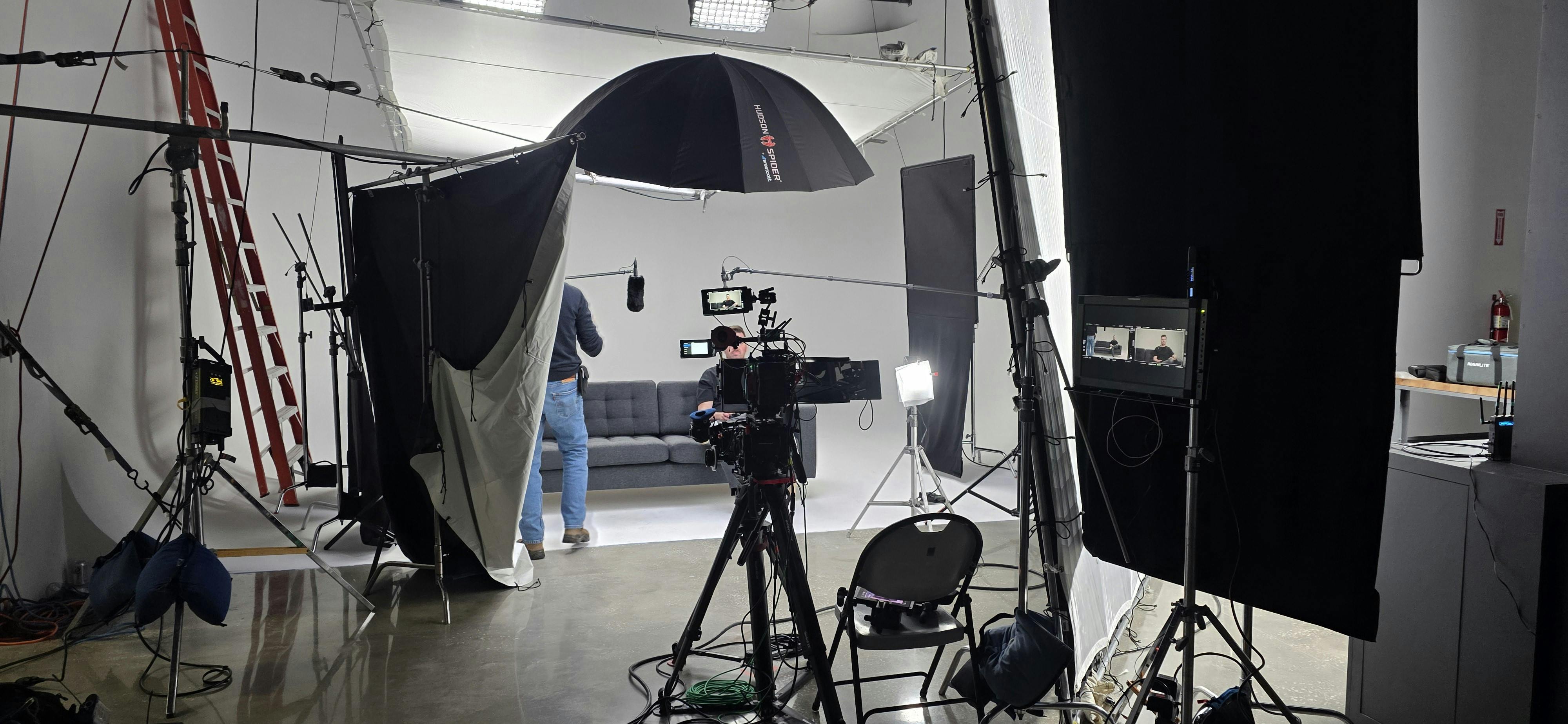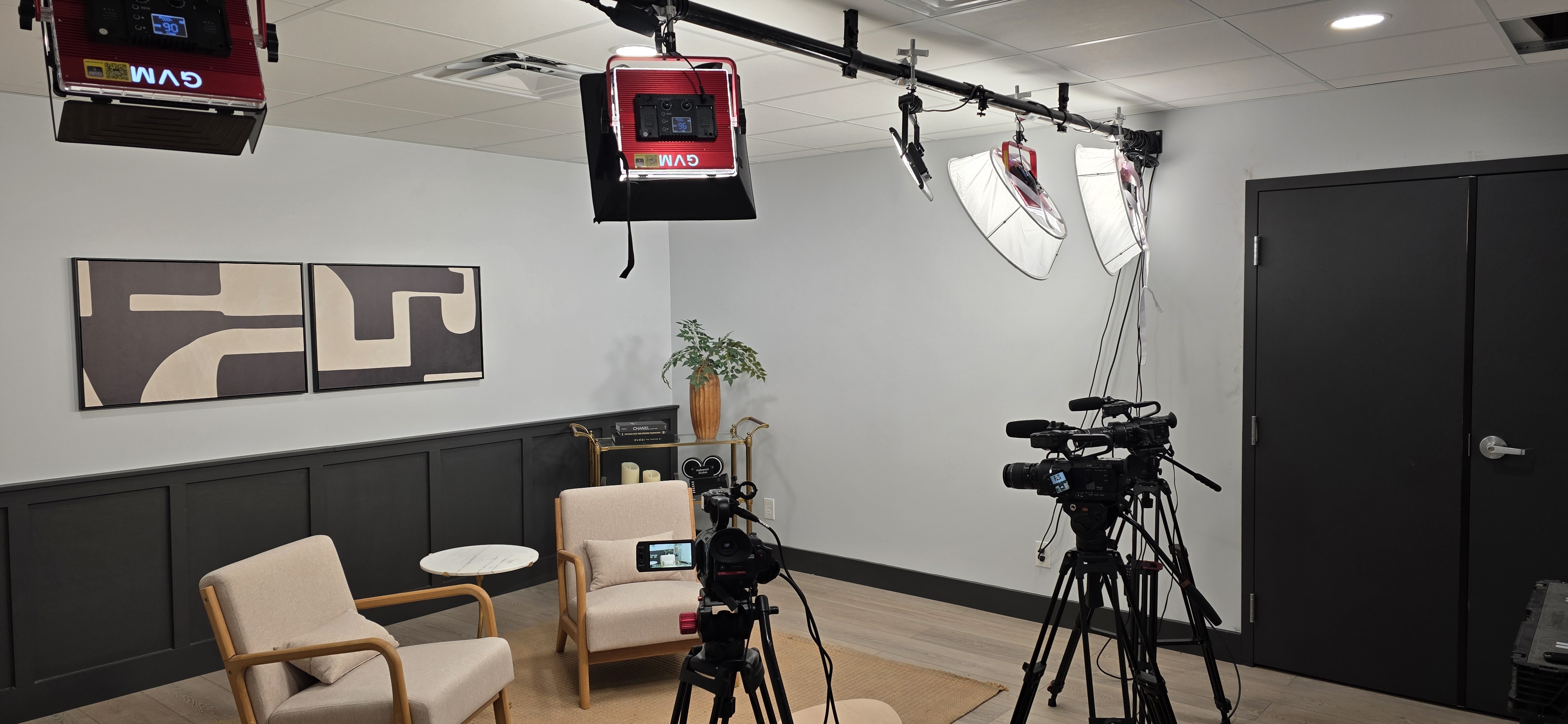 Shear Media Studios offers two production stages under one roof. Studio A is a 2800 sq/ft controlled space ideal for interviews, podcasts, large commercials and live streaming, featuring a white cyclorama, lighting grid and control room access. Studio G is a 5,600 sq ft open stage with a full lighting grid, bay door access, and room for set builds, events, and large-scale productions.