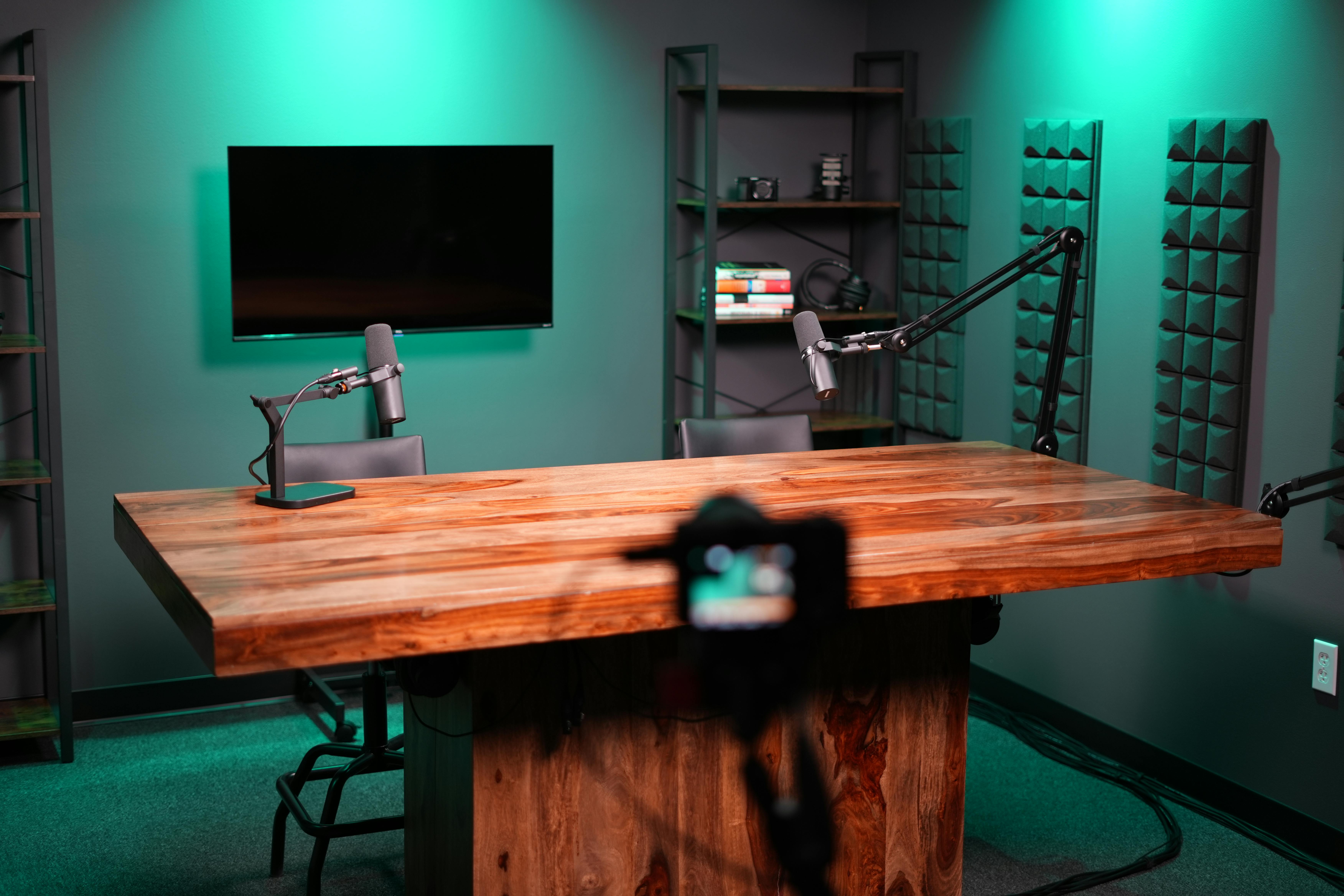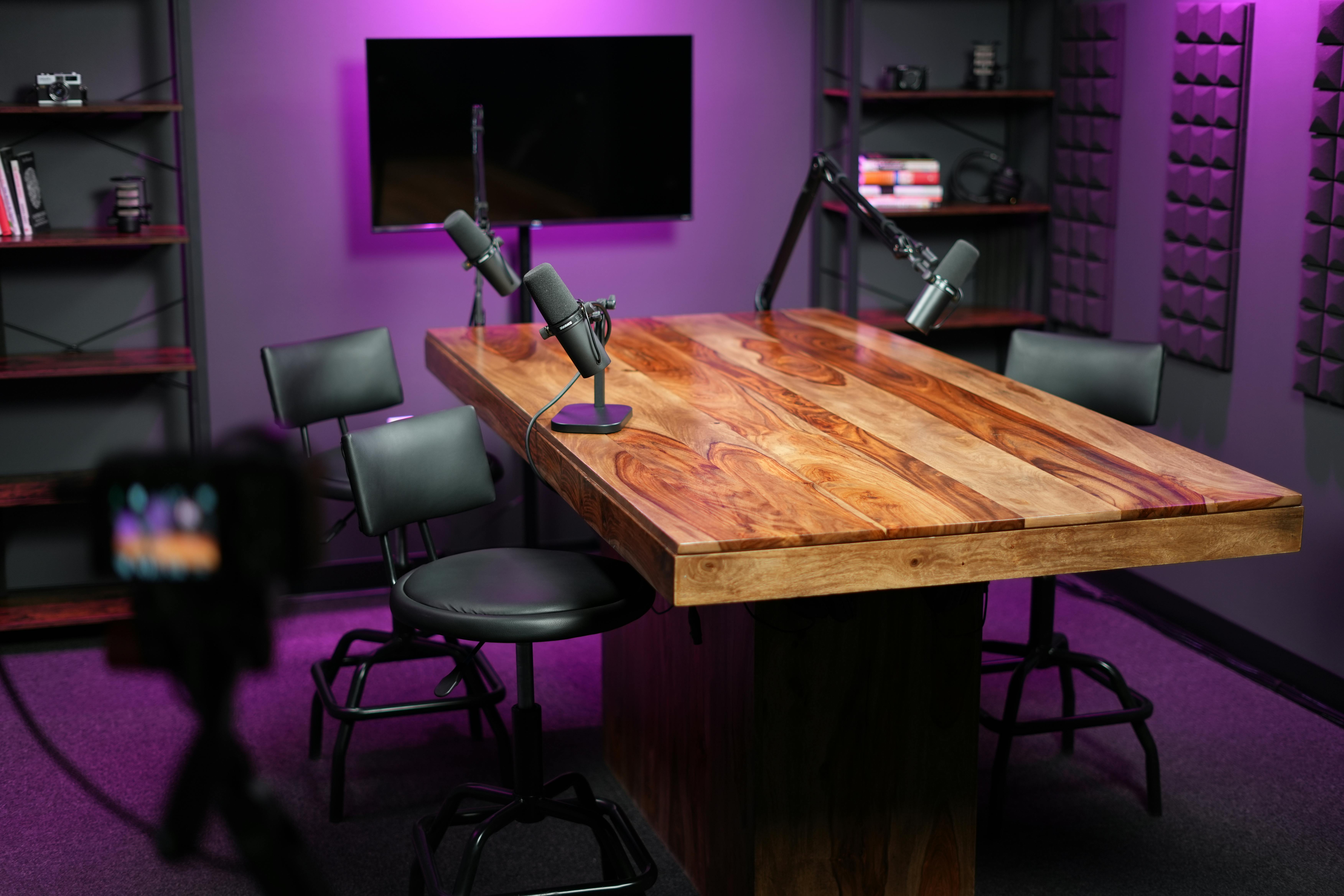 Purpose-built for high-quality audio and video production, this turnkey podcast studio offers a polished recording environment ideal for interviews, branded content, and multi-camera productions.