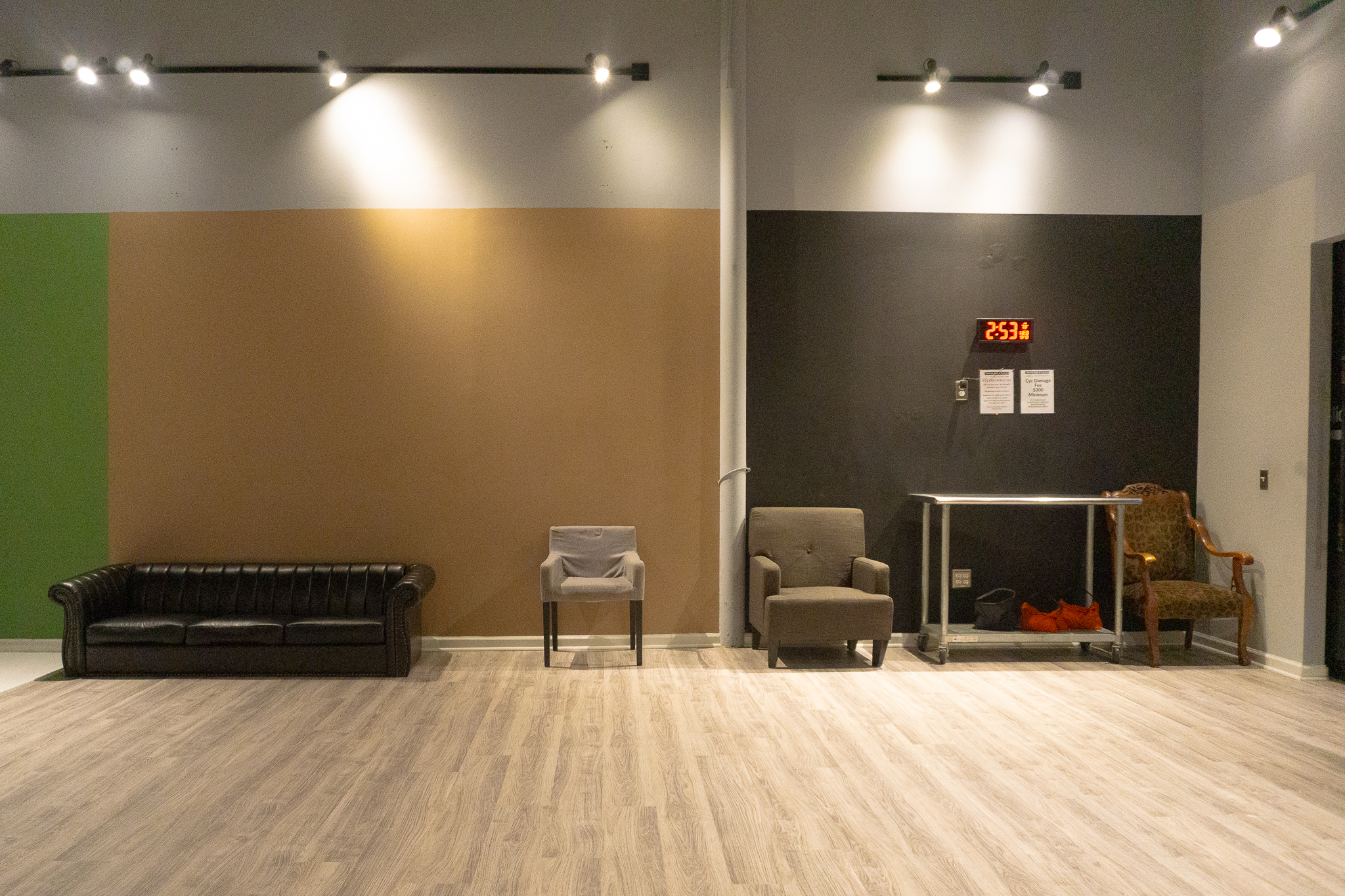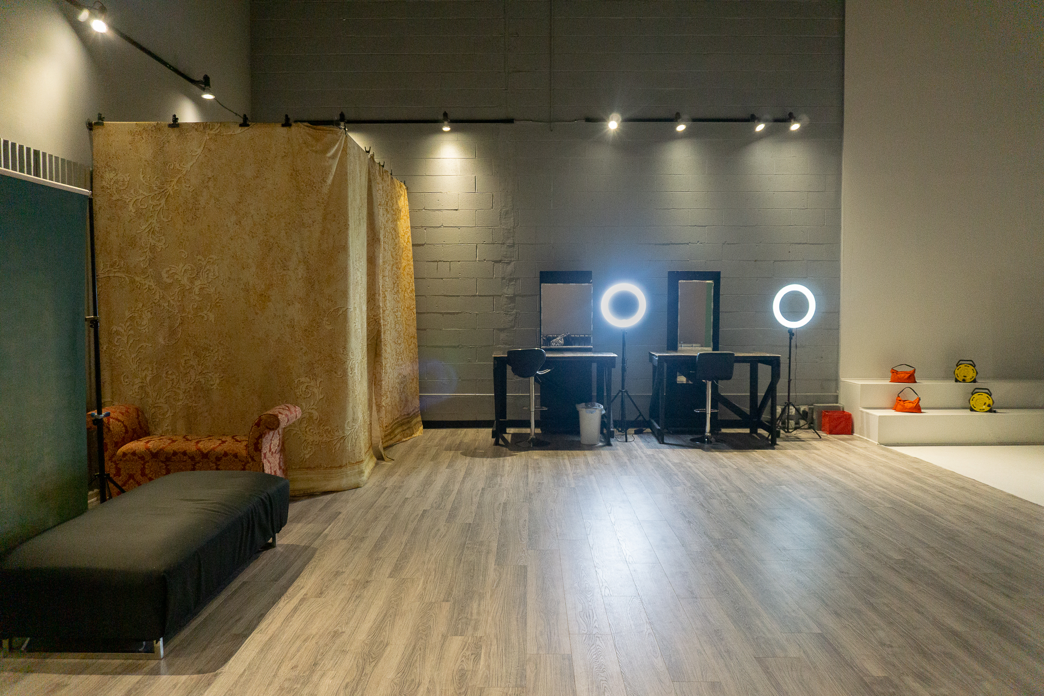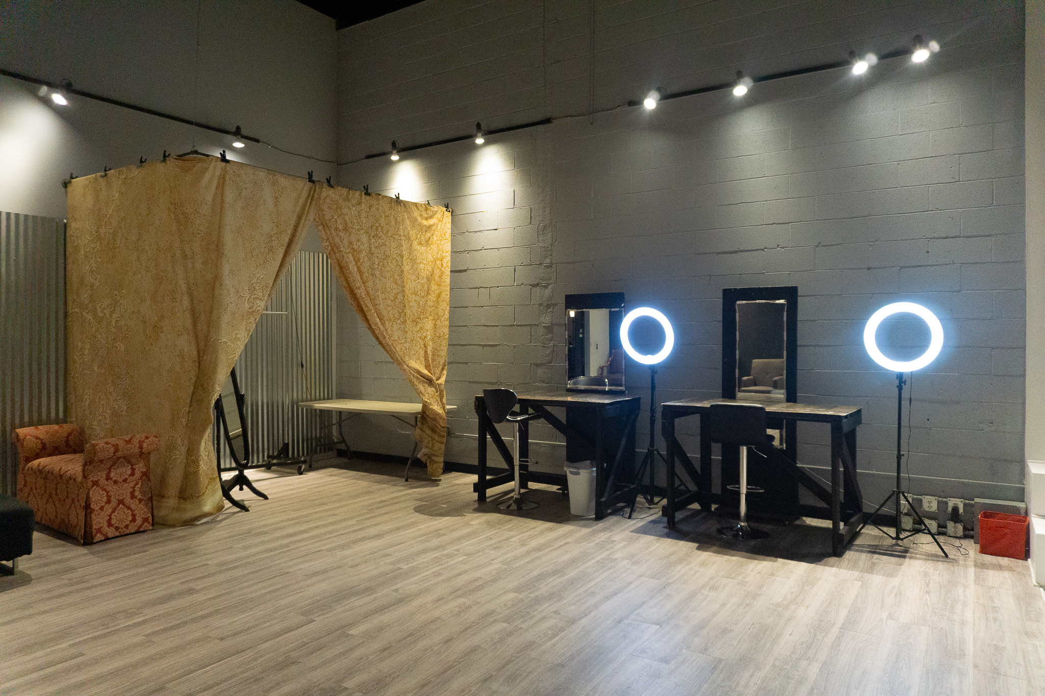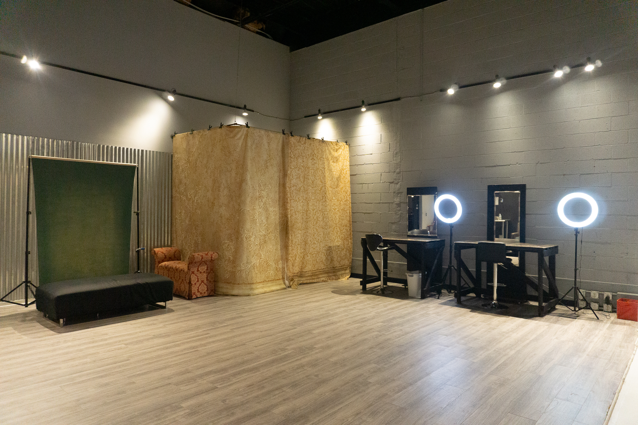 Studio A is a spacious 1,330 sqft studio has more elegant aesthetic, with its wood walls and open layout. It features a large white cyc-wall, a private dressing area and two HMU stations. The studio's 24-foot ceilings create depth, making it a great option for shooting interview interviews as well!