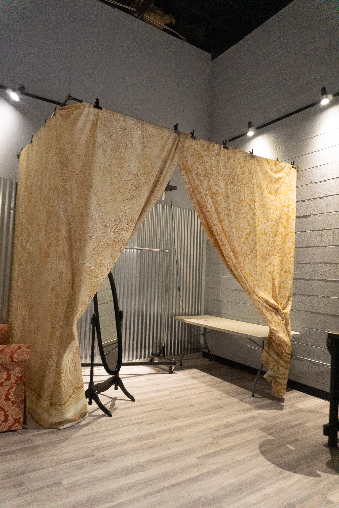 Private wardrobe area with garment rack, mirror, table